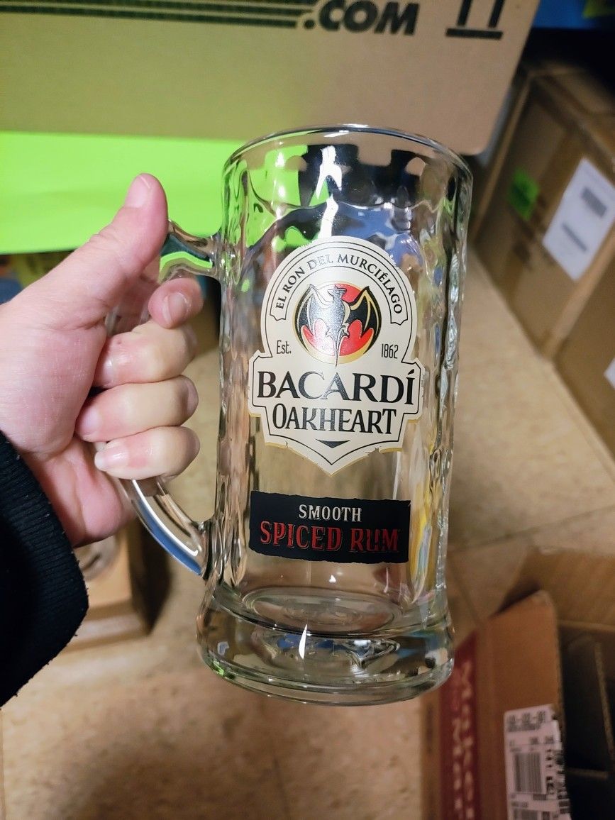 Selling a set of Bacardi Oakheart Spiced Rum beer mugs! These are perfect for enjoying your favorite drinks. They have a classic design and are in great condition. They are made of clear glass with the Bacardi logo on the front. 1 of these glasses is selling for $10 on eBay. Selling all 4 for $10. Cash only pick up only