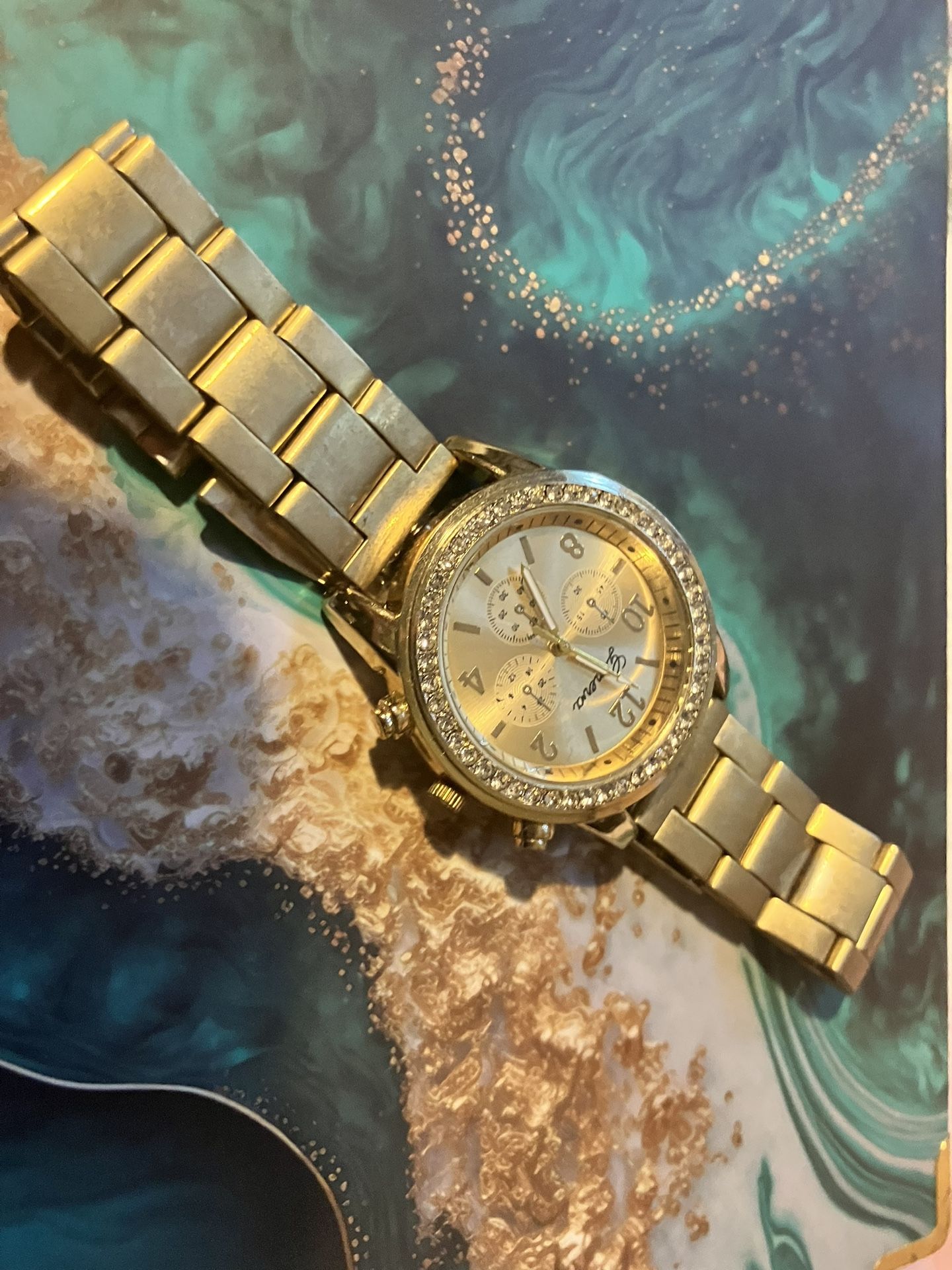 A beautiful Geneva gold-tone fashion watch features a sparkling rhinestone bezel and a bold, chronograph-style face. This piece is both eye-catching and versatile. Details: • Brand: Geneva • Gold-tone metal band • Decorative chronograph subdials • Crystal-accented bezel for added shine • Adjustable link bracelet (fits most wrists) • Gently used, in good working condition • Battery-operated (may need new battery) Perfect for everyday wear or a night out, this watch combines affordable fashion with timeless design.