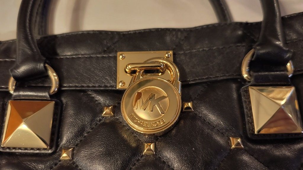 Upgrade your style with this stunning authentic Michael Kors Hamilton Studded Quilted Leather Tote in classic Black with Gold hardware. This bag is brand new (open box) and in pristine condition—not a single scuff, mark, or scratch anywhere. The leather is buttery soft with a quilted finish, accented by gold pyramid studs that give it a bold, glamorous look. Features include: Quilted black leather with gold stud detailing Signature Hamilton lock in polished gold Dual rolled leather handles Gold chain + leather shoulder strap Spacious interior with multiple pockets Ideal for everyday use or a statement night-out piece Comes from a smoke-free home This bag is no longer widely available in stores and is highly sought after—perfect for collectors or anyone wanting a luxury statement bag in flawless shape. *See my profile for more purses