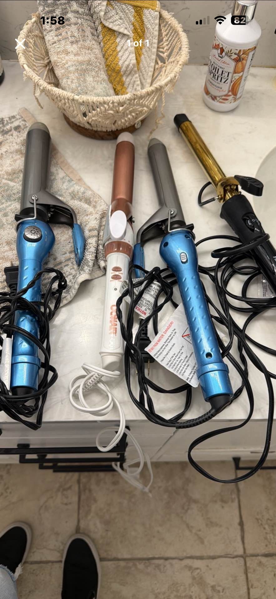 2 babyliss curling iron 1.5” and 1” $20 each Conair 1” $15 Pluginged .5” $15