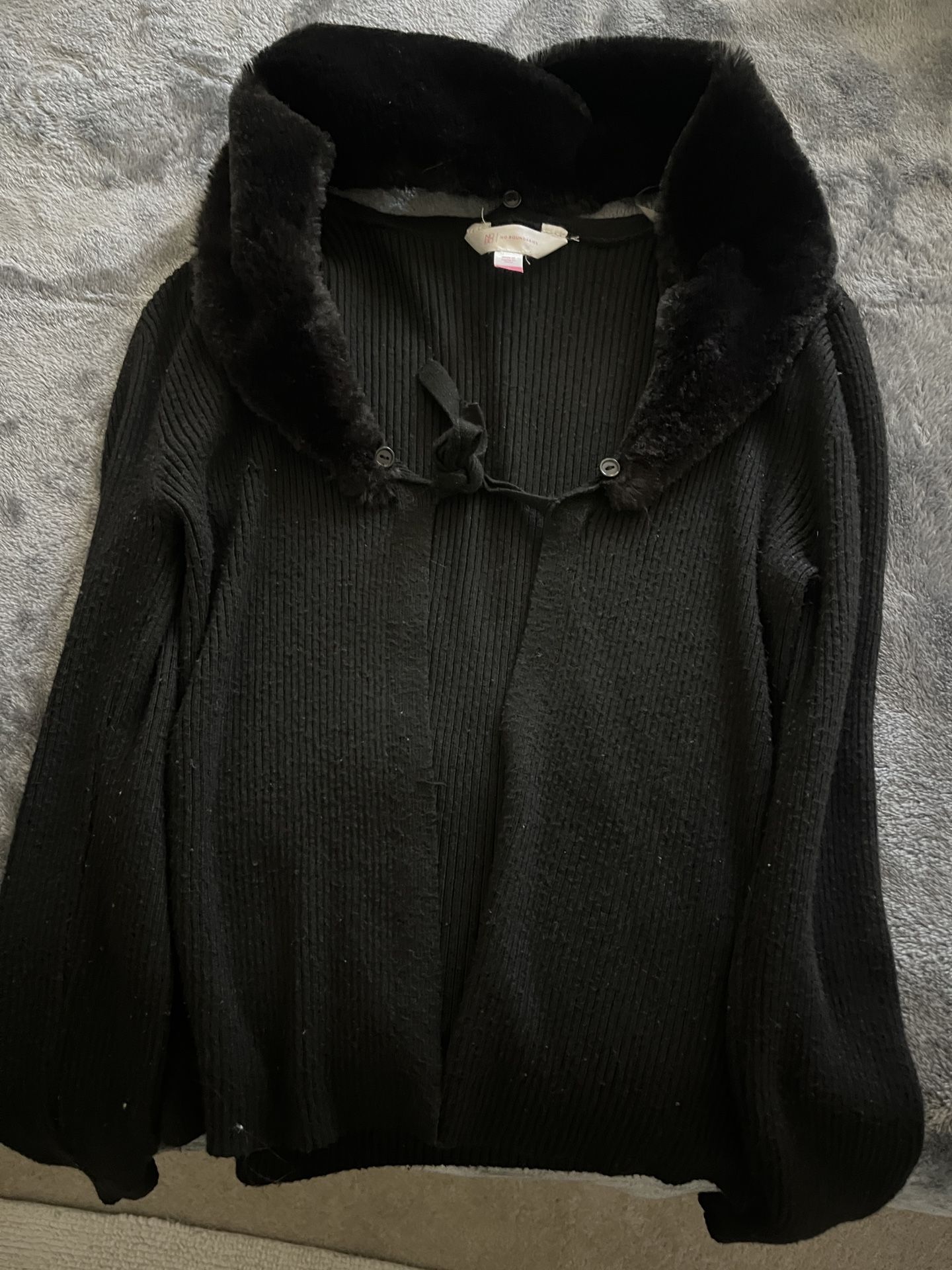Cover sweater, it’s thin but it’s warm, the fuzzy part of the sweater comes off Size Small