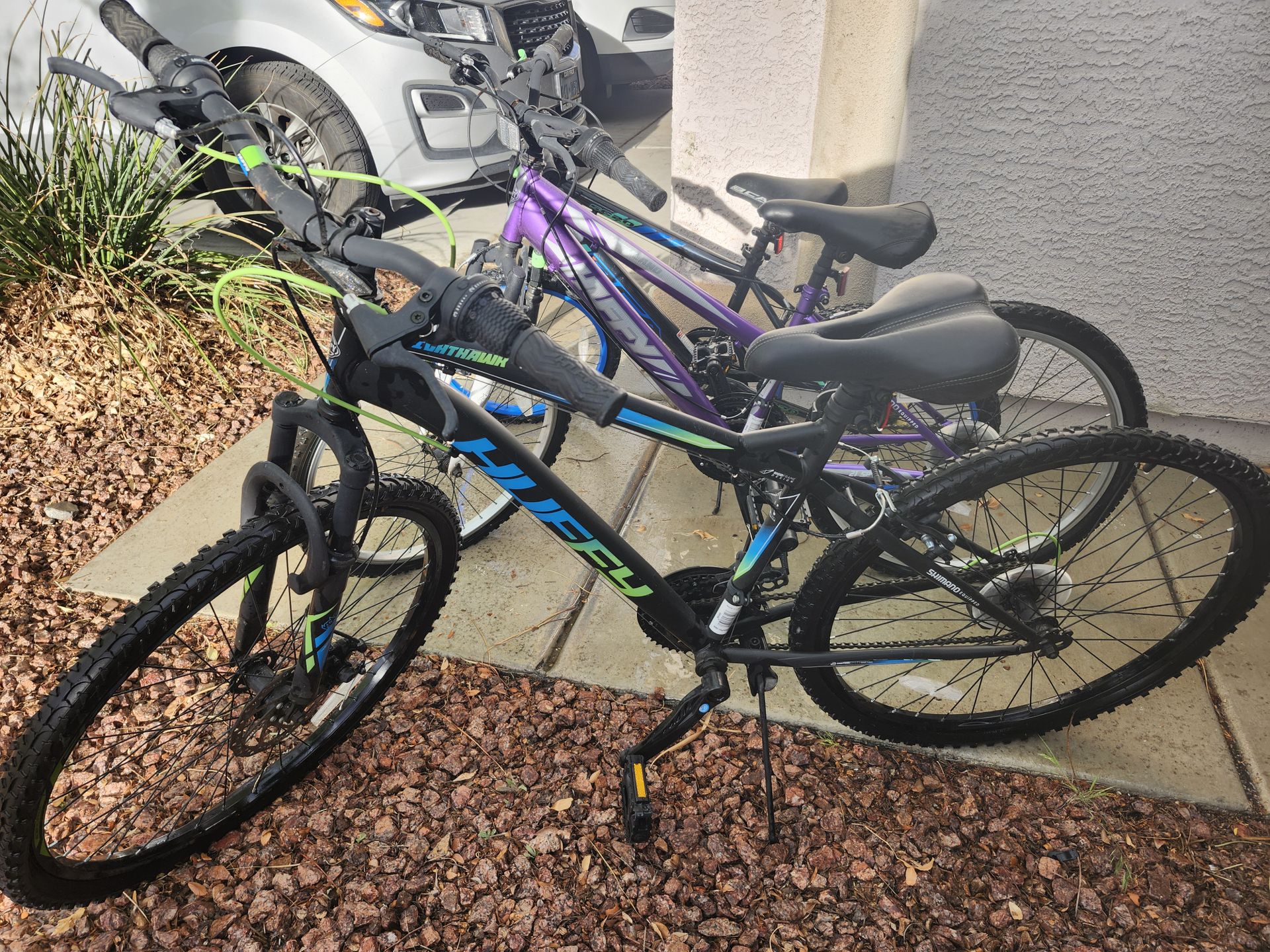 Selling 3 bikes together for $80 total. • 1 adult mountain bike (black/green) • 1 youth bike (purple) • 1 kids bike (black/blue) Condition: All bikes have been sitting unused for about 2 years. Tires need replacement. The purple bike has a broken rear brake. Good project bikes or for someone who can fix them.