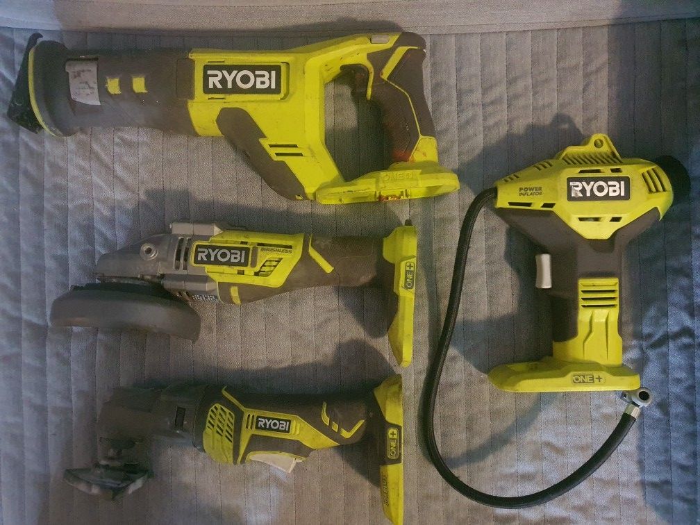 ***Used in working condition*** ☆These are TOOL ONLY, batteries not included☆ 《 Bring your own battery for testing before buying 》 tools included: -Ryobi ONE+ 18V Cordless Reciprocating Saw PCL515 (TOOL ONLY) -Ryobi ONE+ 18V Cordless 4-1/2 in. Angle Grinder P423 (TOOL ONLY) -Ryobi ONE+ 18V Cordless Oscillating Multi-Tool P246 (TOOL ONLY) -Ryobi 18-Volt ONE+ Cordless Power Inflator P737 (TOOL ONLY) 《 Bring your own battery for testing before buying 》 cash only ● no trades ● ready to meet right now Asking $120 OBO