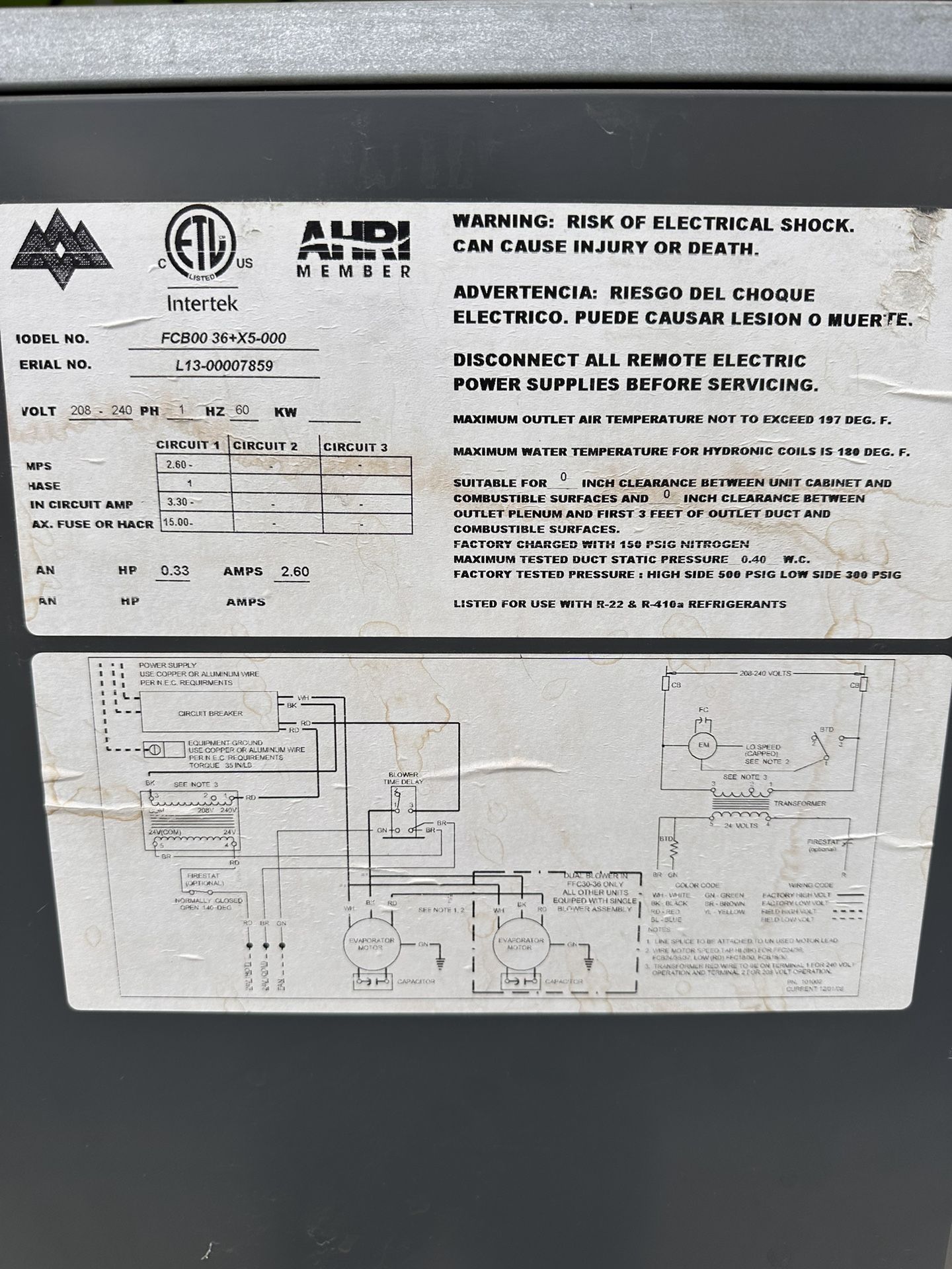 Brand new FCB series ceiling mount electric heat dx cool air handler unit. It’s been in my garage for years. Never installed. Ready r-22 or r-410a. This is a 3 ton unit. Can be installed with most 3 ton compressor units.
