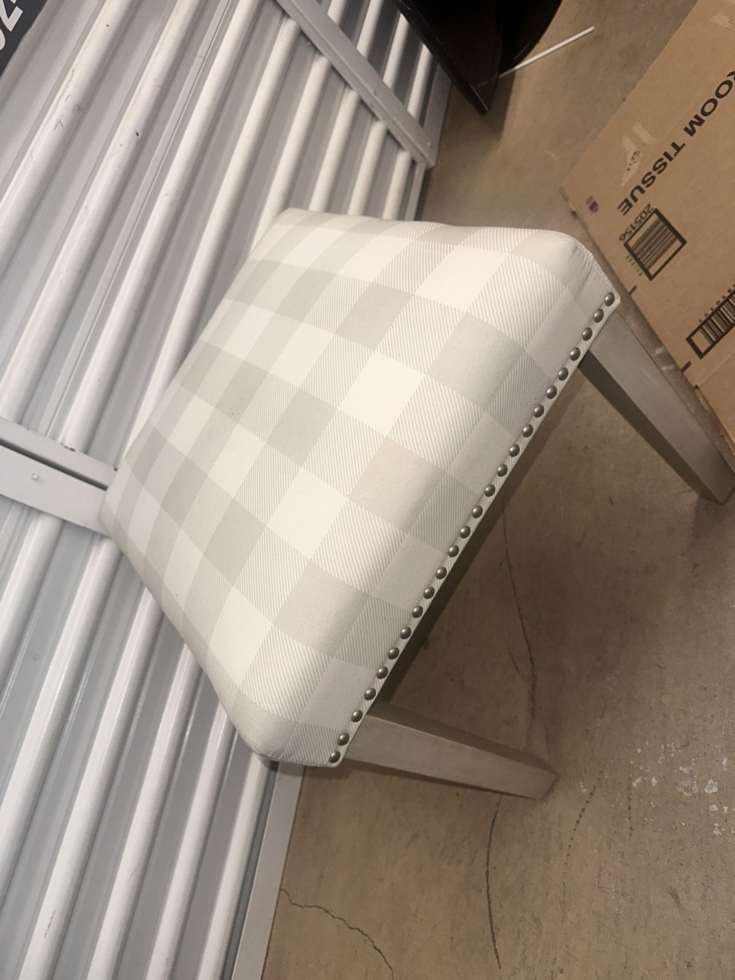 Good condition grey and white checkered small foot stool ottoman use it to sit on or prop your feet on. It’s very comfortable. Can drop off if needed!