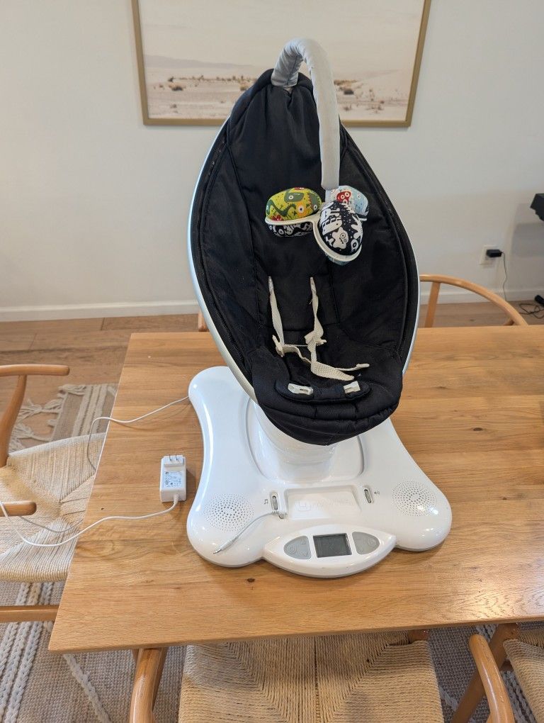 4 Moms brand baby swing with 5 different rocking motions and different speeds. Aux jack was broken, but everything else works. Great for babies who want to be held to sleep and you need a break.