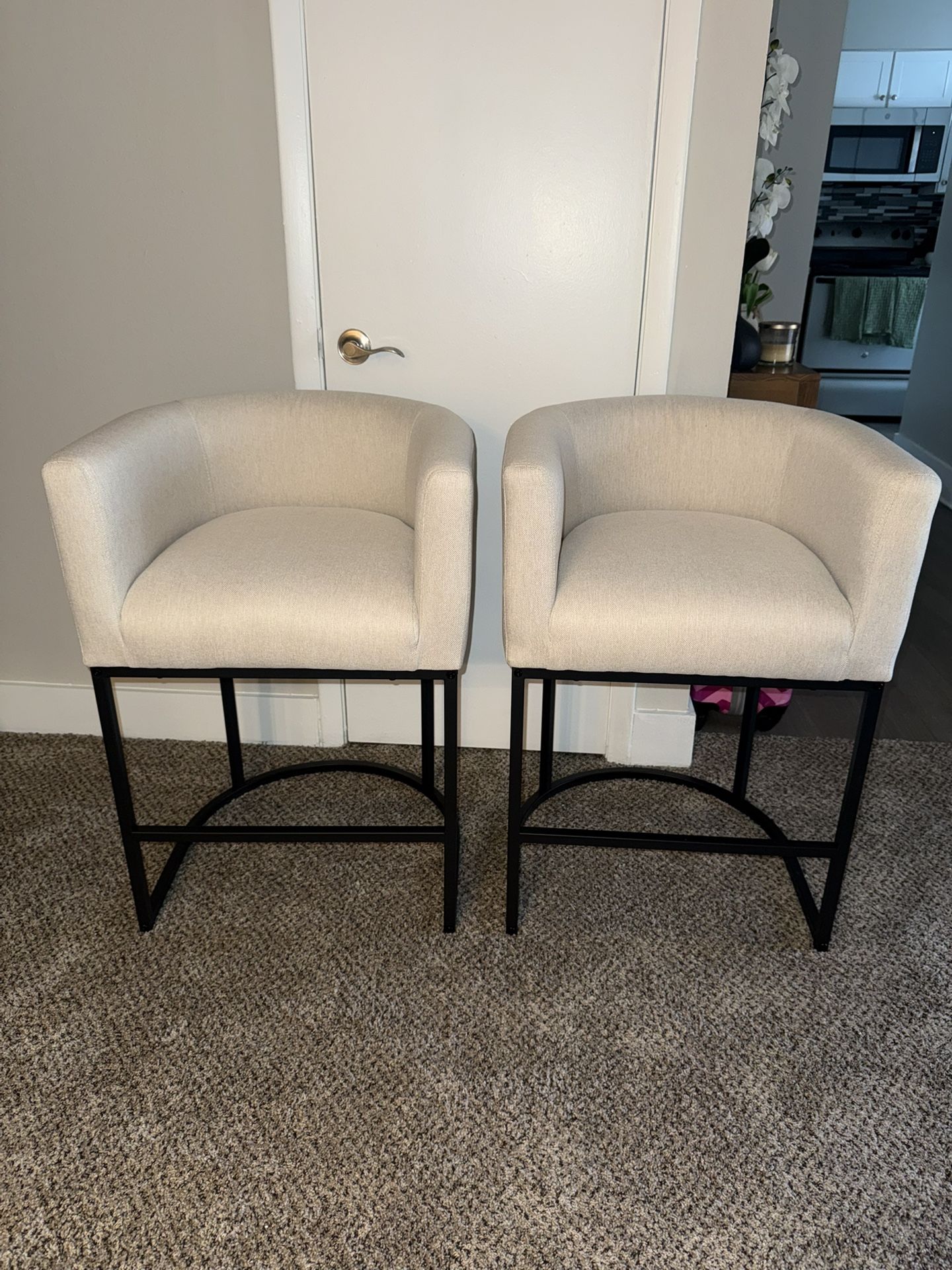Brand new barstool chairs (just opened 2 days ago) 26” height with beige cushion. No stains or damage. Only selling cause the height doesn’t work with our table.