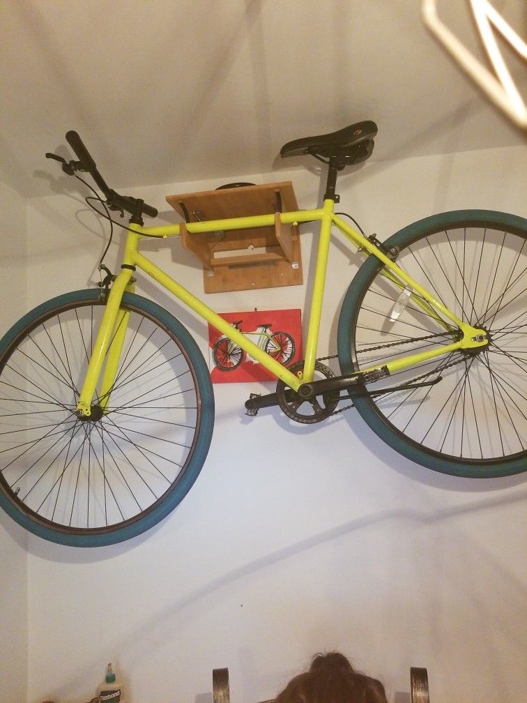 Neon yellow with blue tires. Single speed bike. Recently replaced crankshaft and had brakes tightened