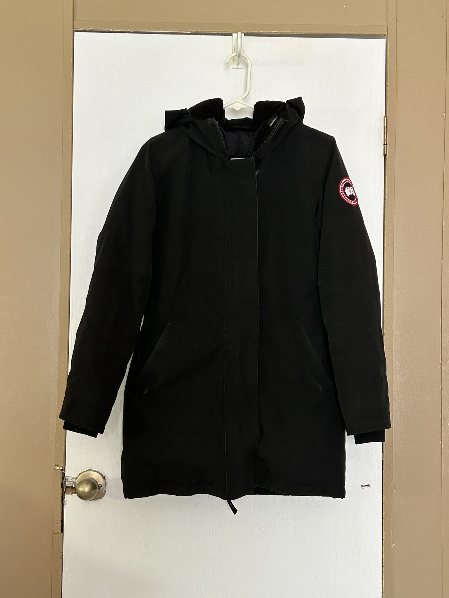 Canada goose jacket hooded size small. Jacket has sings of wear and one of the snaps doesn’t work. If the item is listing it is available shipping only thank you