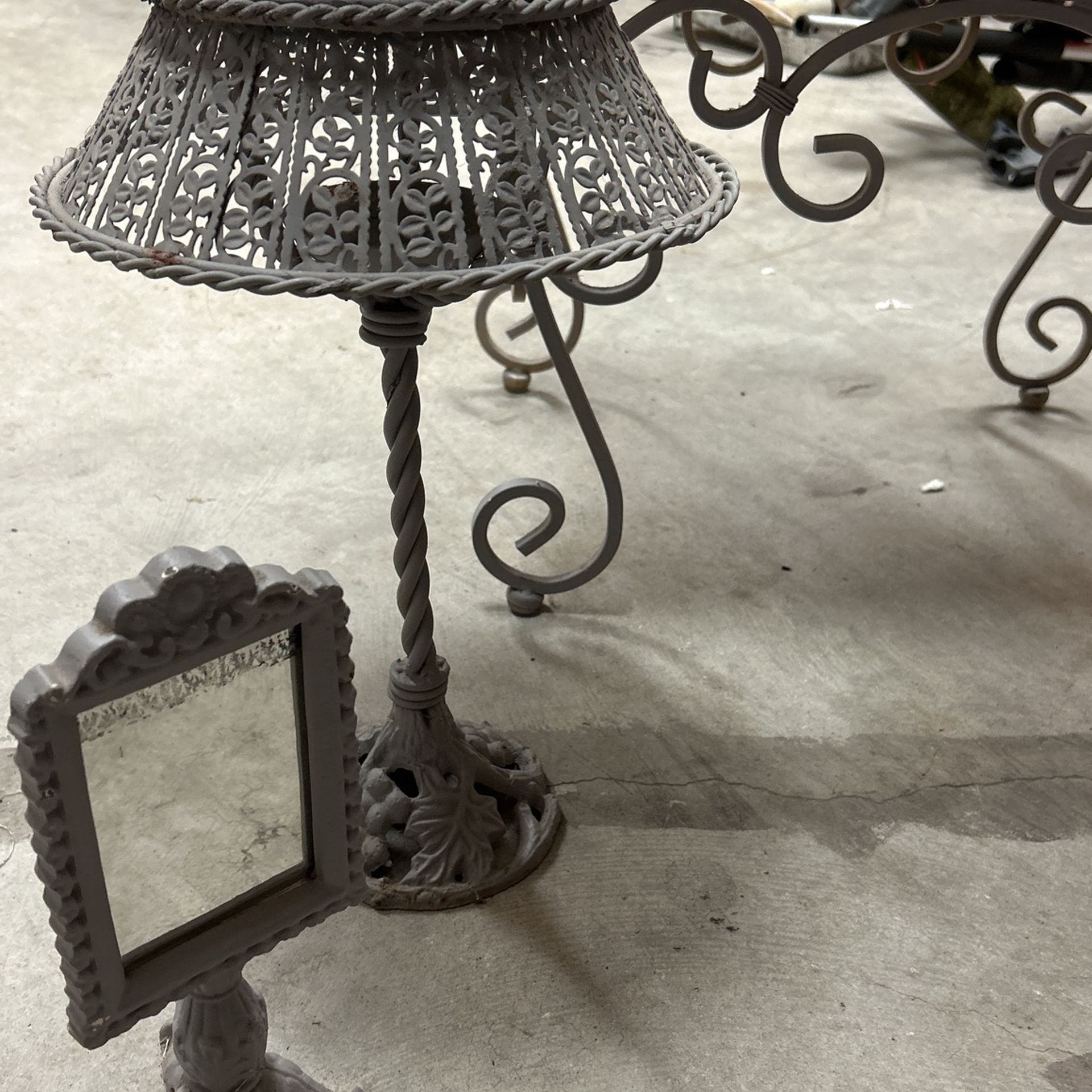 Good project to restore …already primed . Set included seat, needs to be covered . Candle holder , and mirror /picture frame Wrought iron . Vintage