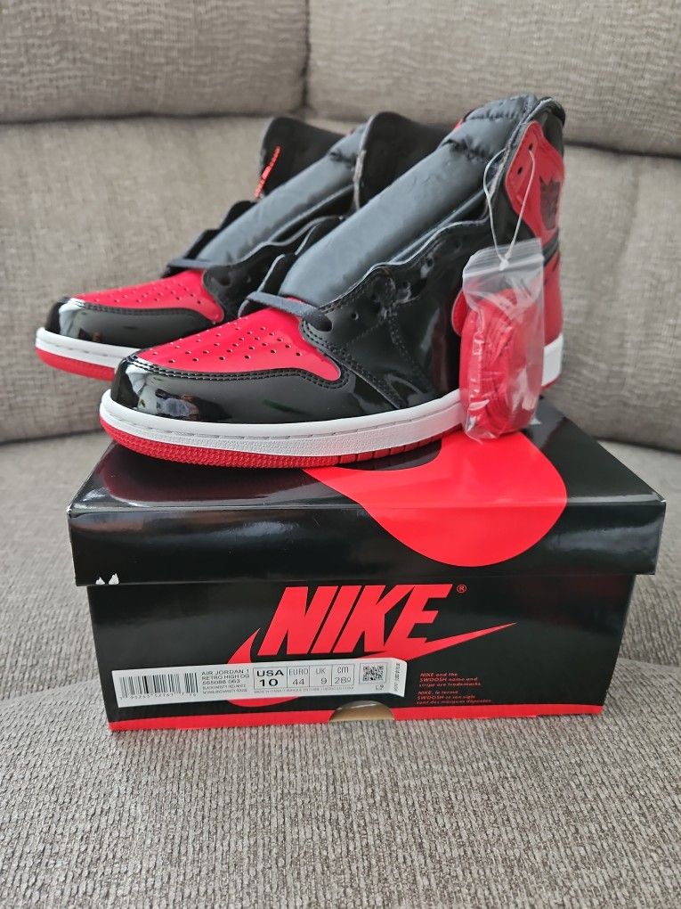 Brand new Air Jordan 1 Retro Patent Bred size 10. Comes with extra red laces and hangman tag.