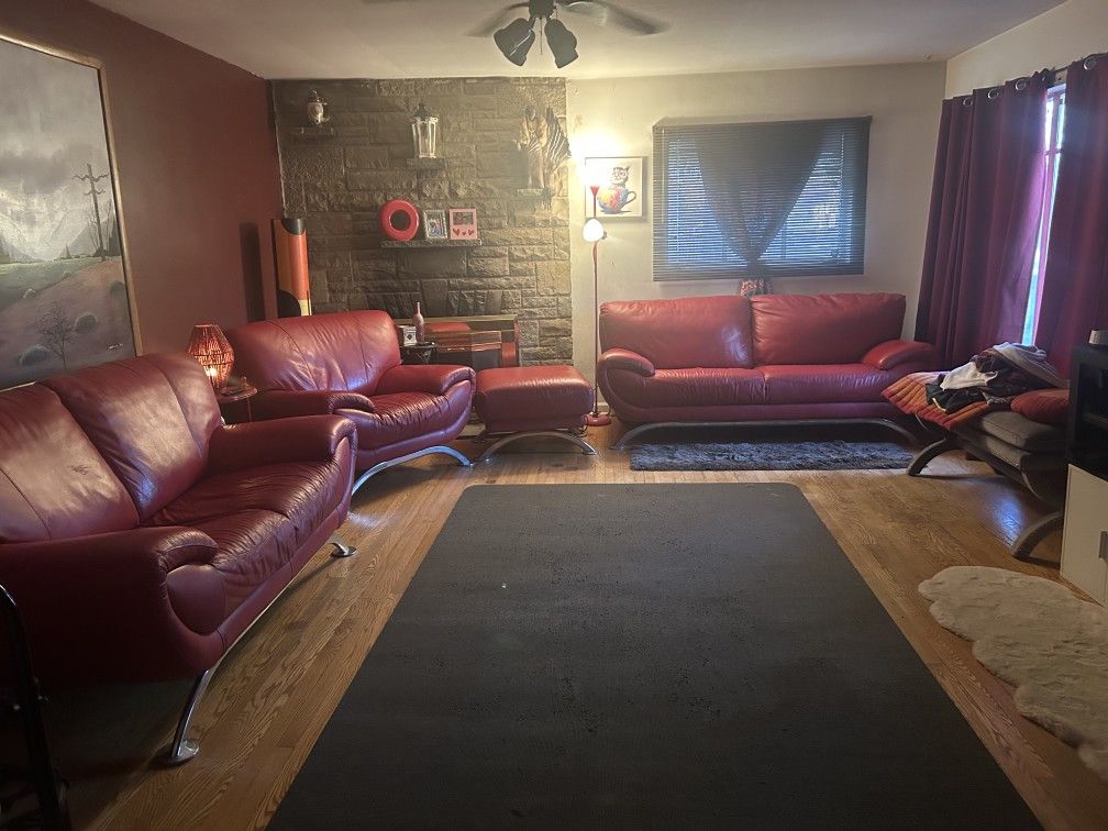 Red leather furniture has some minor cat scratches. Needs a little cleaning. Perfect for homeowner who has pets.