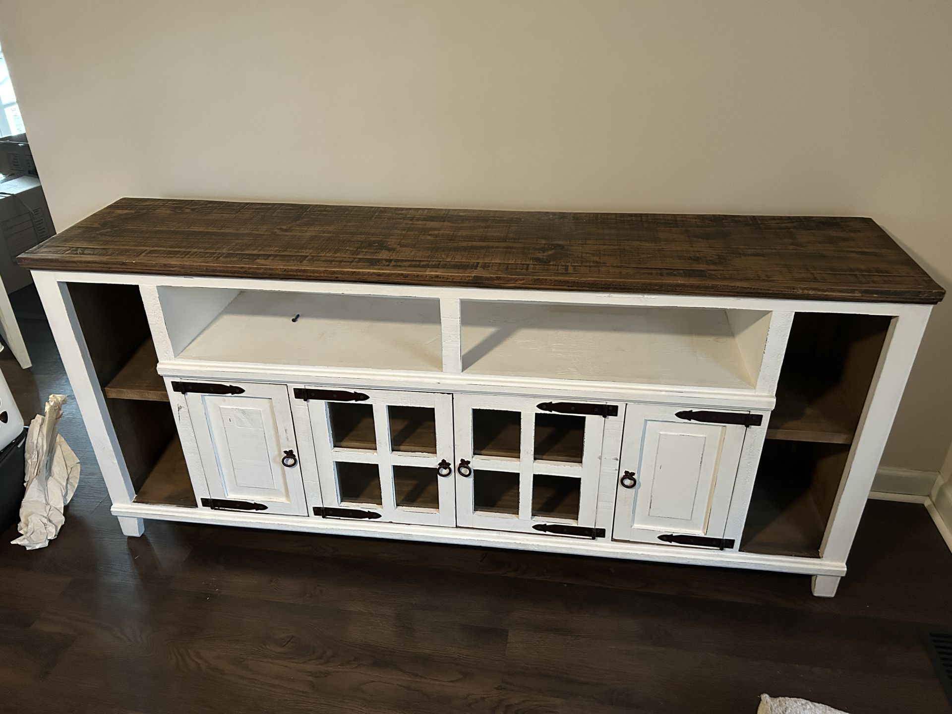 Rustic looking entertainment center Solid wood design with glass windows 17.5” wide 80” long 36” tall In good shape