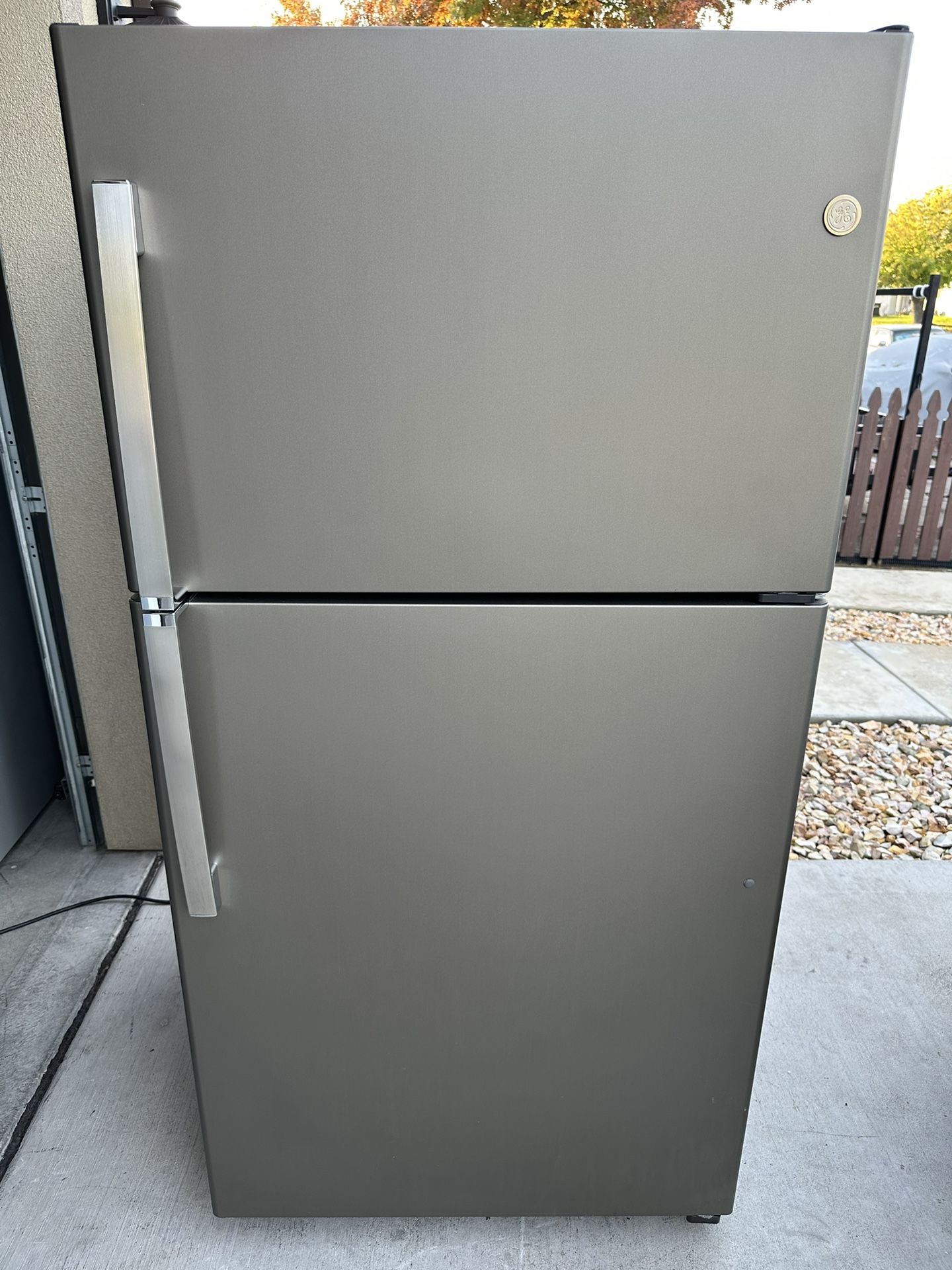 22 cubic top freezer bottom refrigerator. Slate gray. 33 inches wide. Beautiful exterior condition. Clean inside. Works absolutely perfectly without any issues at all. Plugged in for you to test. Extra cost to deliver.