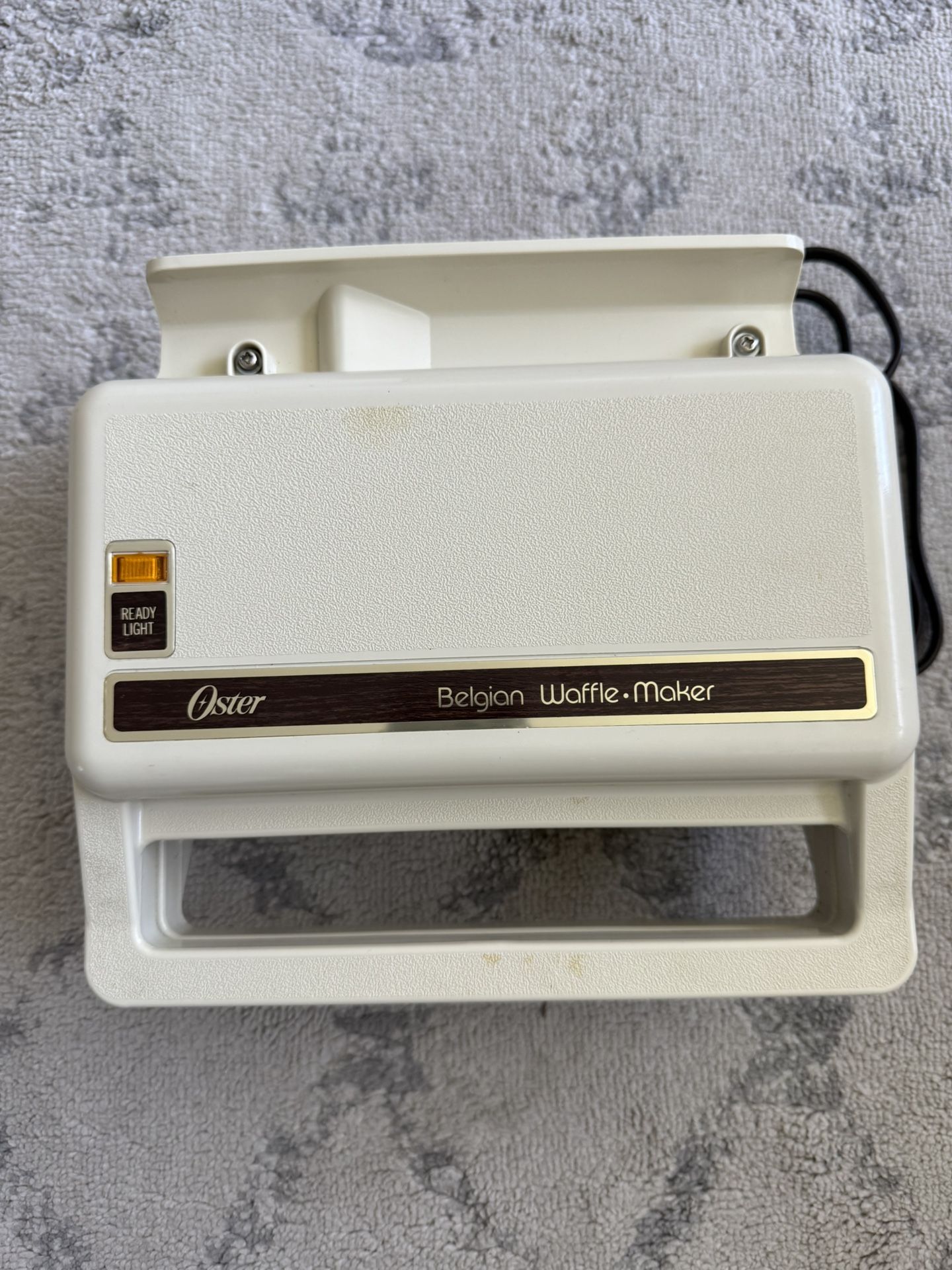 Selling a vintage Oster Gold n Crispy Belgian Waffle Maker in good working condition! Built back in the day with parts that were made to last! This waffle maker is still working perfectly and looks awesome! Features: - Non-stick plates for easy release and cleaning. - Ready light indicates when the waffle maker is preheated and ready for batter. - Cool-touch handle for safe handling. Cash/Venmo/Apple Pay only, no trades. Call or text anytime!