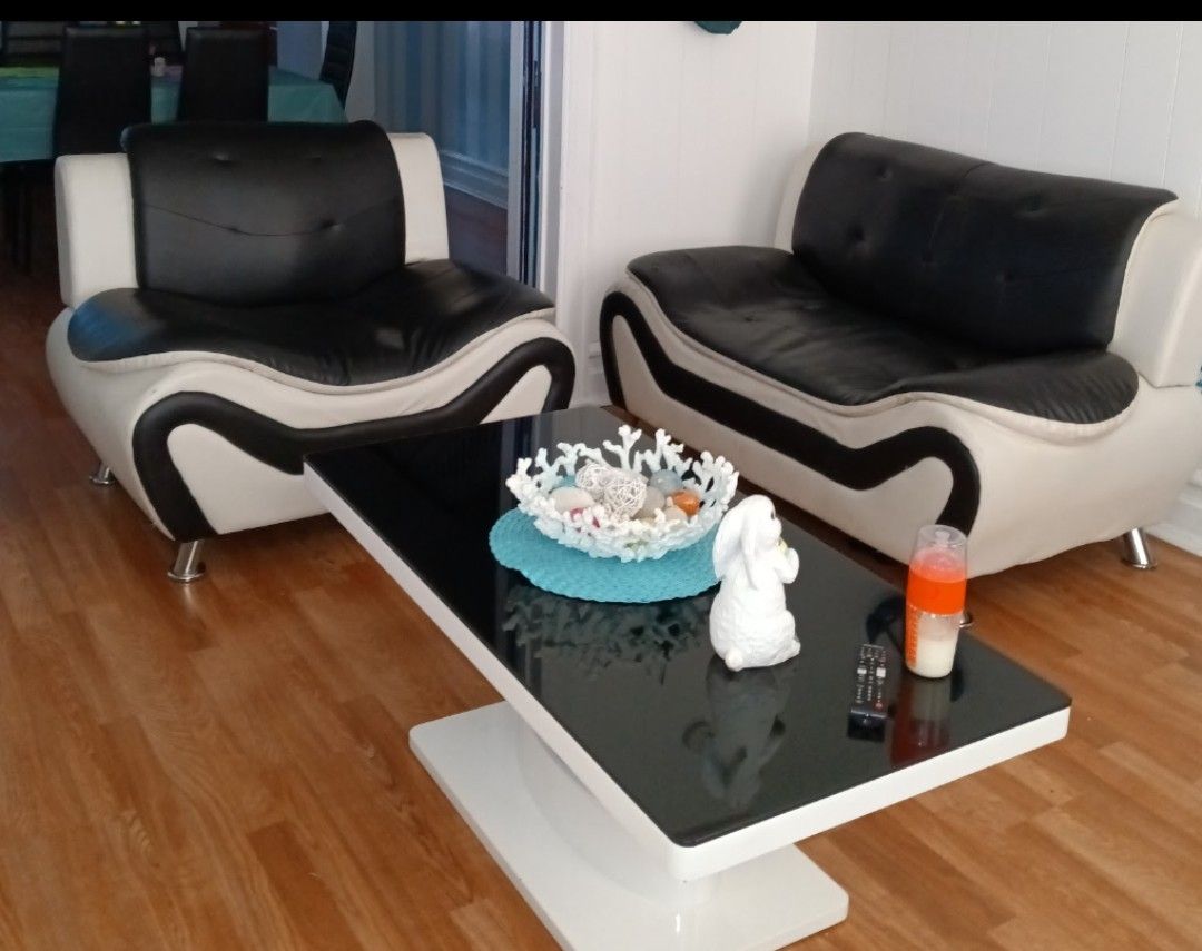 Living room set brand new. Perfect condition. 2 small sofa 1 medium sofa 1 stand tv 2 coffee tables Only pick up