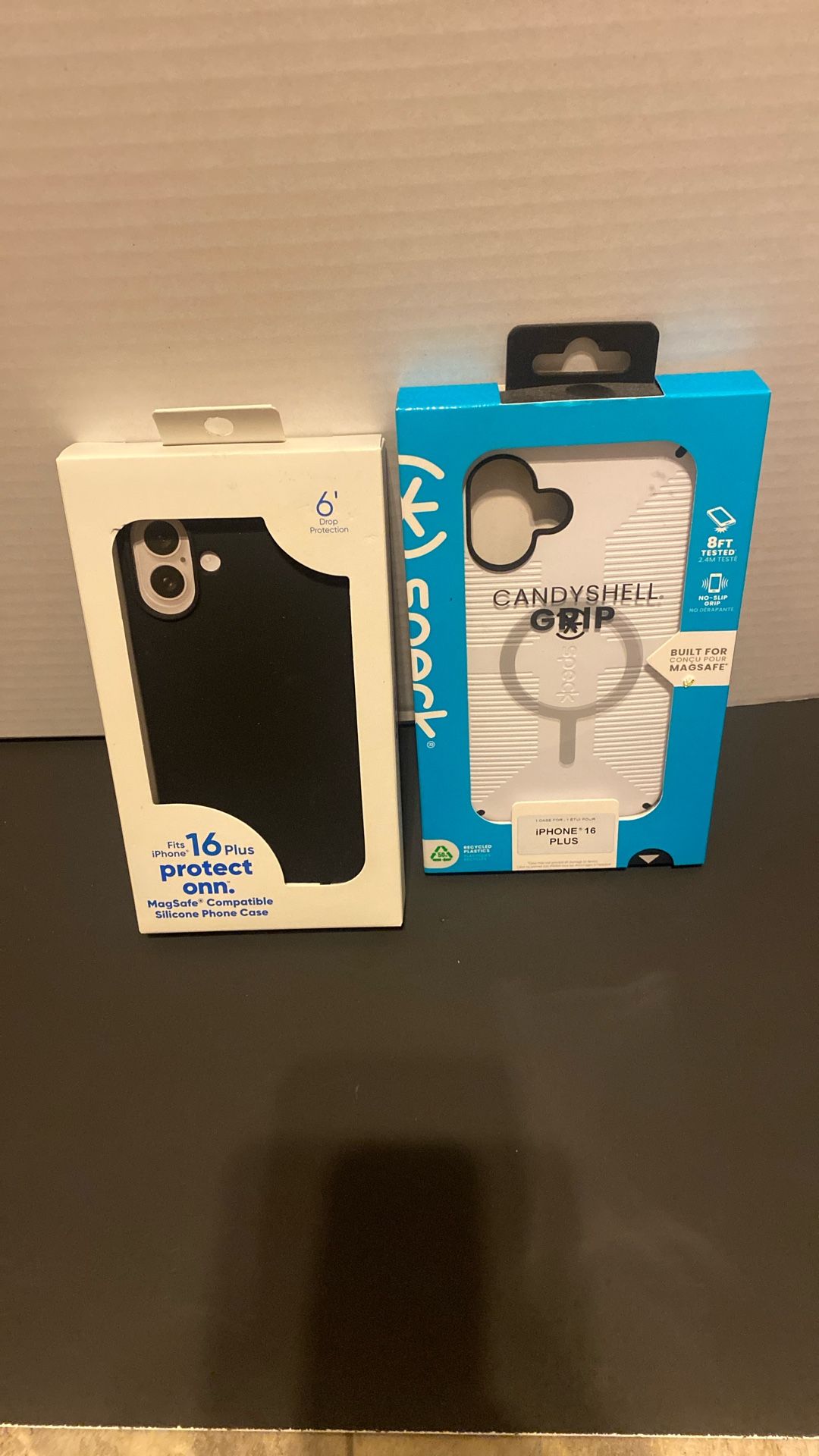 Speck candy shell grip for iPhone 16 plus , dual-layer cushioning, 8ft drop tested raised bezel camera and screen , and MagSafe. Onn silicone MagSafe case for iPhone 16 plus 6ft drop tested. Both cases for $30 obo.
