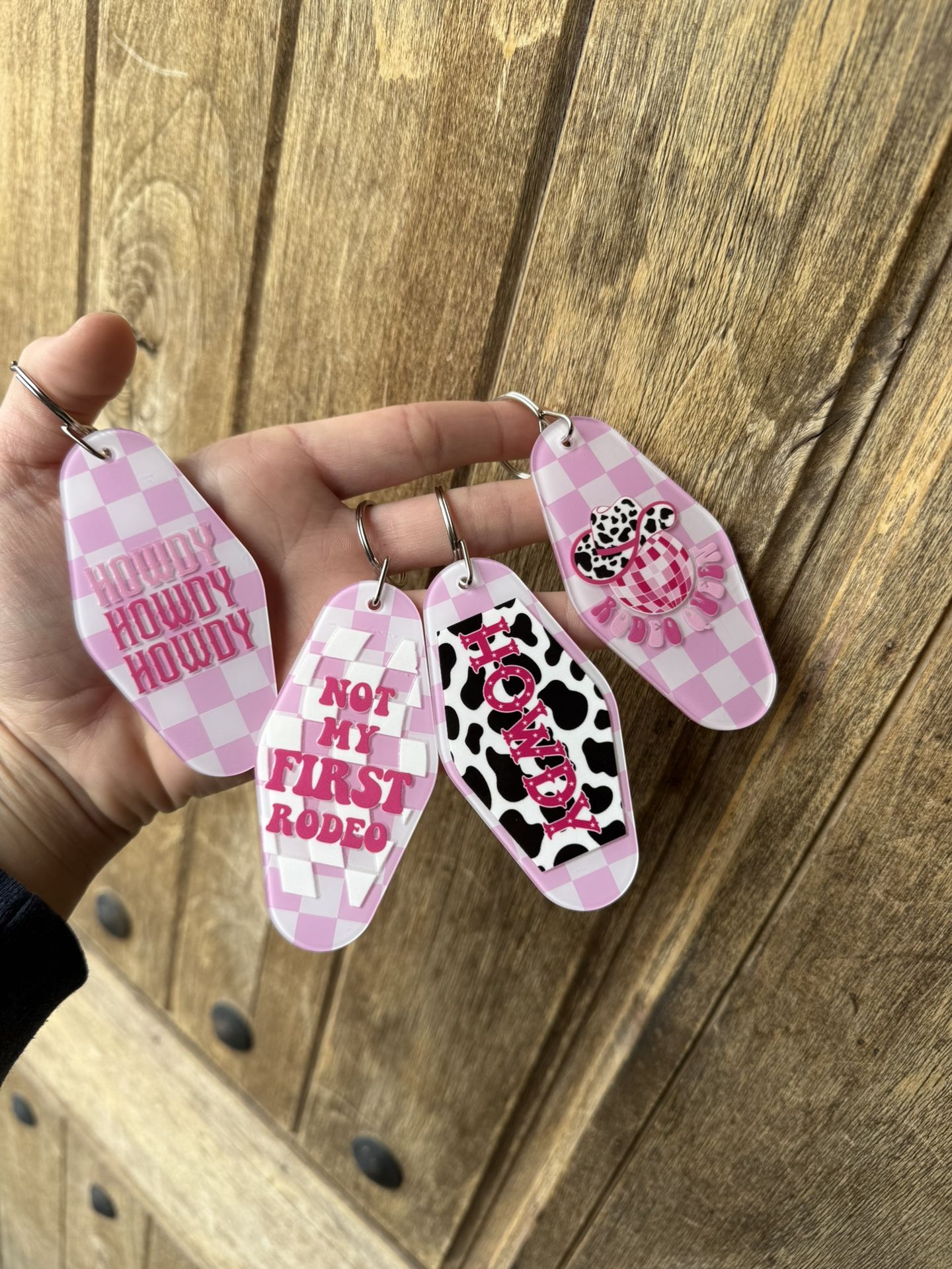 4 keychains available. $3 each 3.5in x 1.75in Cross streets valley view and sunset “Not my first rodeo” and “rodeo queen” have designs on the back as well.