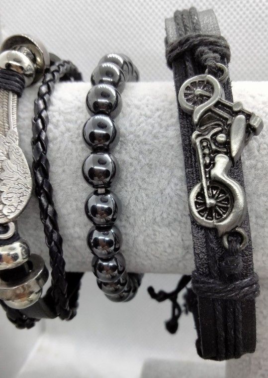 1 Hematite, 1 Wood Beads,1 Wing 🪽 Leather and a Motorcycle Leather Bracelet. Set of 4.