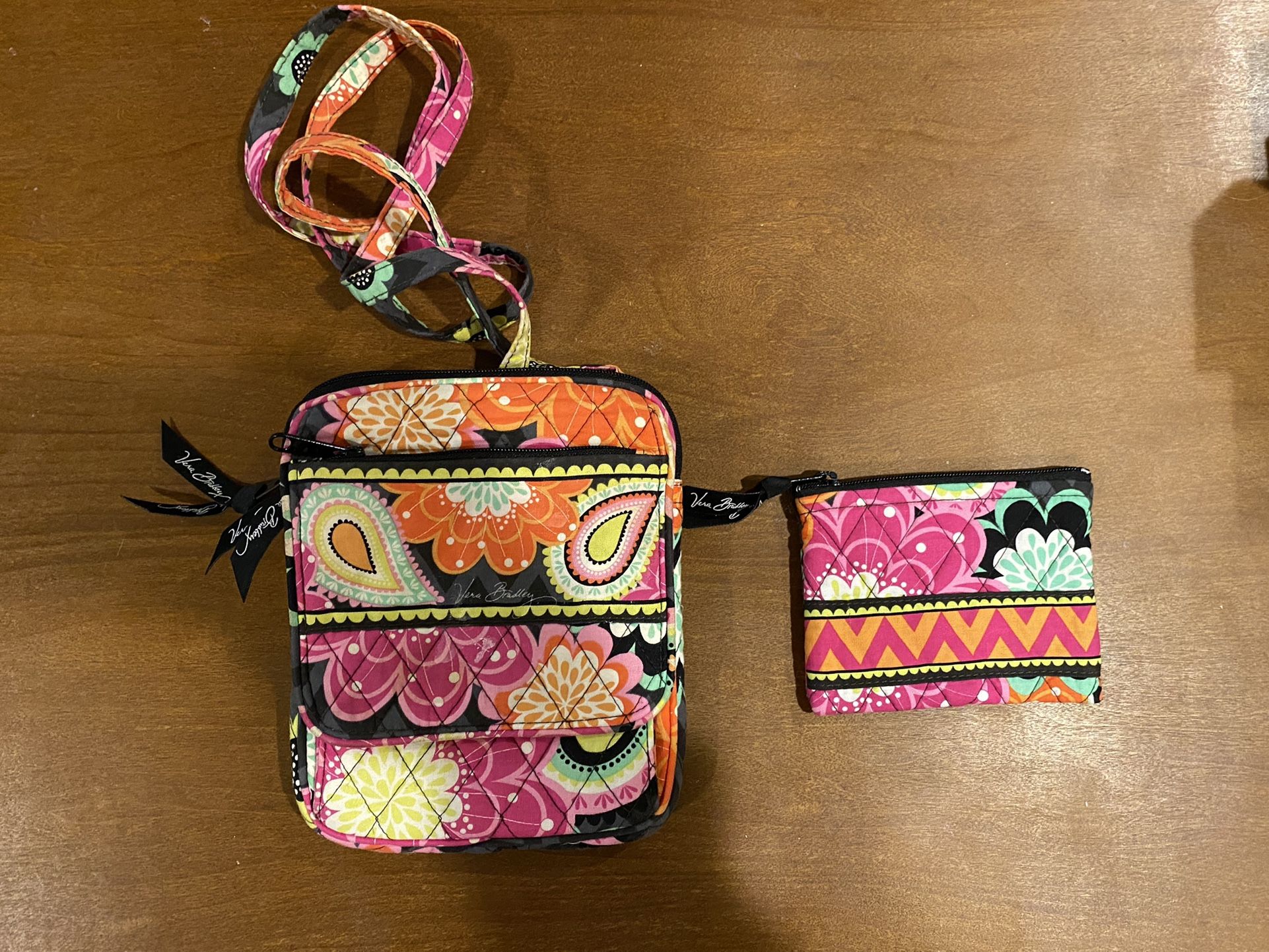 VERA BRADLEY - "MINI HIPSTER" - Ziggy Zinnia Pattern OVER THE SHOULDER STYLE PURSE - PERFECT FOR EVERYDAY USE! Comes with a mini change purse. FULL ZIPPERED POCKET AND A SLIP IN POCKET ON OUTSIDE OF BAG INSIDE ARE 3 SLOTS FOR CREDIT CARDS IN A POCKET THAT OPEN UP FOR EASIER ACCESS AND A CLEAR ID SPOT UNDER FLAP - FULL ZIP CLOSURE AND ALSO A MAGNETIC SNAP FLAP MEASURES APPROX: 8" TALL X 6" ACROSS WITH LONG SHOULDER STRAP