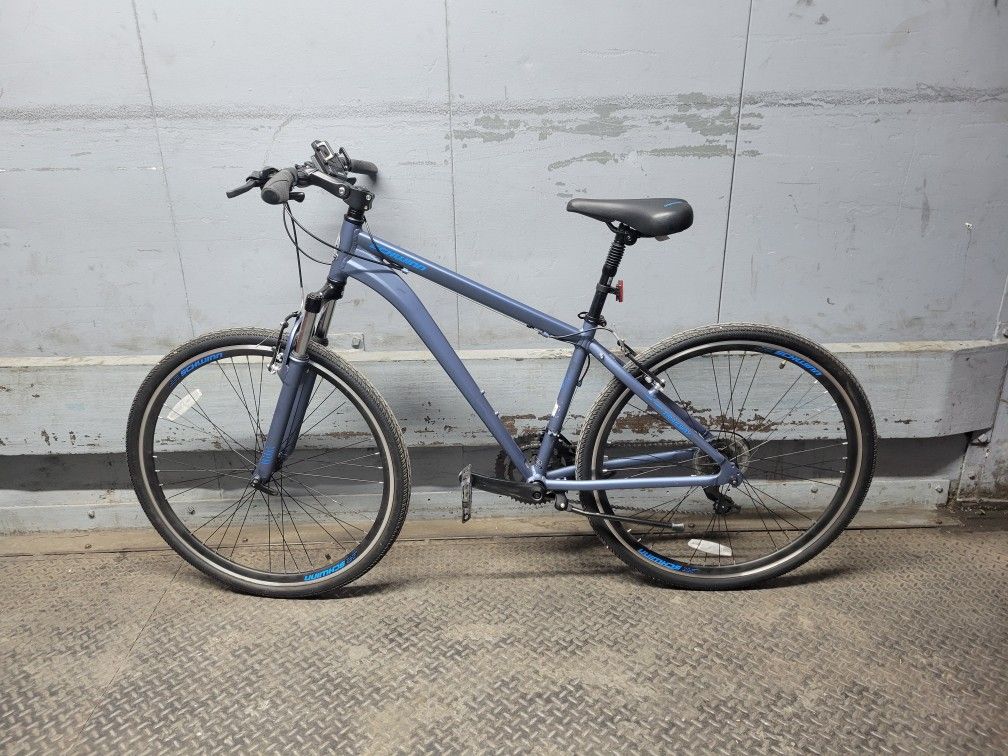 This is a Schwinn Trailway hybrid bicycle with a blue frame. It features Shimano V-Brake levers and a phone mount attached to the handlebars. Perfect for commuting or recreational rides! Condition like new. No need to do or fix anything, just get and ride. Pick up location: 5900 Decatur Street Ridgewood, NY 11385