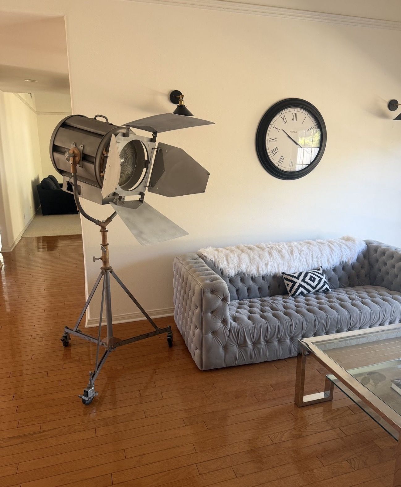 Authentic vintage Mole-Richardson Type 415 Senior Solarspot, originally used on film and TV sets in Hollywood. This massive 5,000-watt studio light sits on its original rolling stand and has been sandblasted for a clean industrial look. Currently non-functional and intended for decorative use only, but it makes an incredible statement piece for lofts, studios, or film-themed interiors. Dimensions: approx. 6 ft tall with stand Condition: Non-working, decorative use only Asking price: $700 OBO