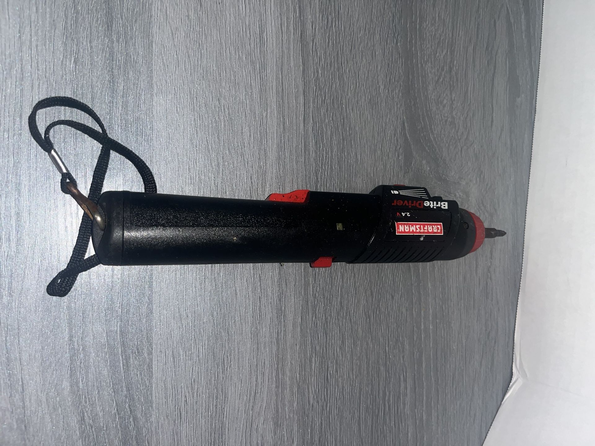 Craftsman Brite Driver 2.4V rechargeable cordless screwdriver. Powers on and functions properly. Built-in flashlight feature. Includes strap. Pre-owned with normal wear.
