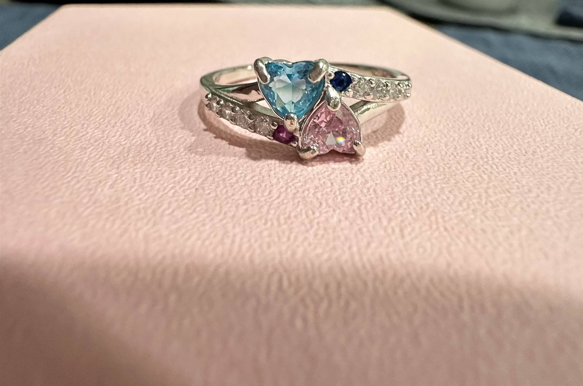 Pink and Blue heart ring with Blue and Red mini stones
