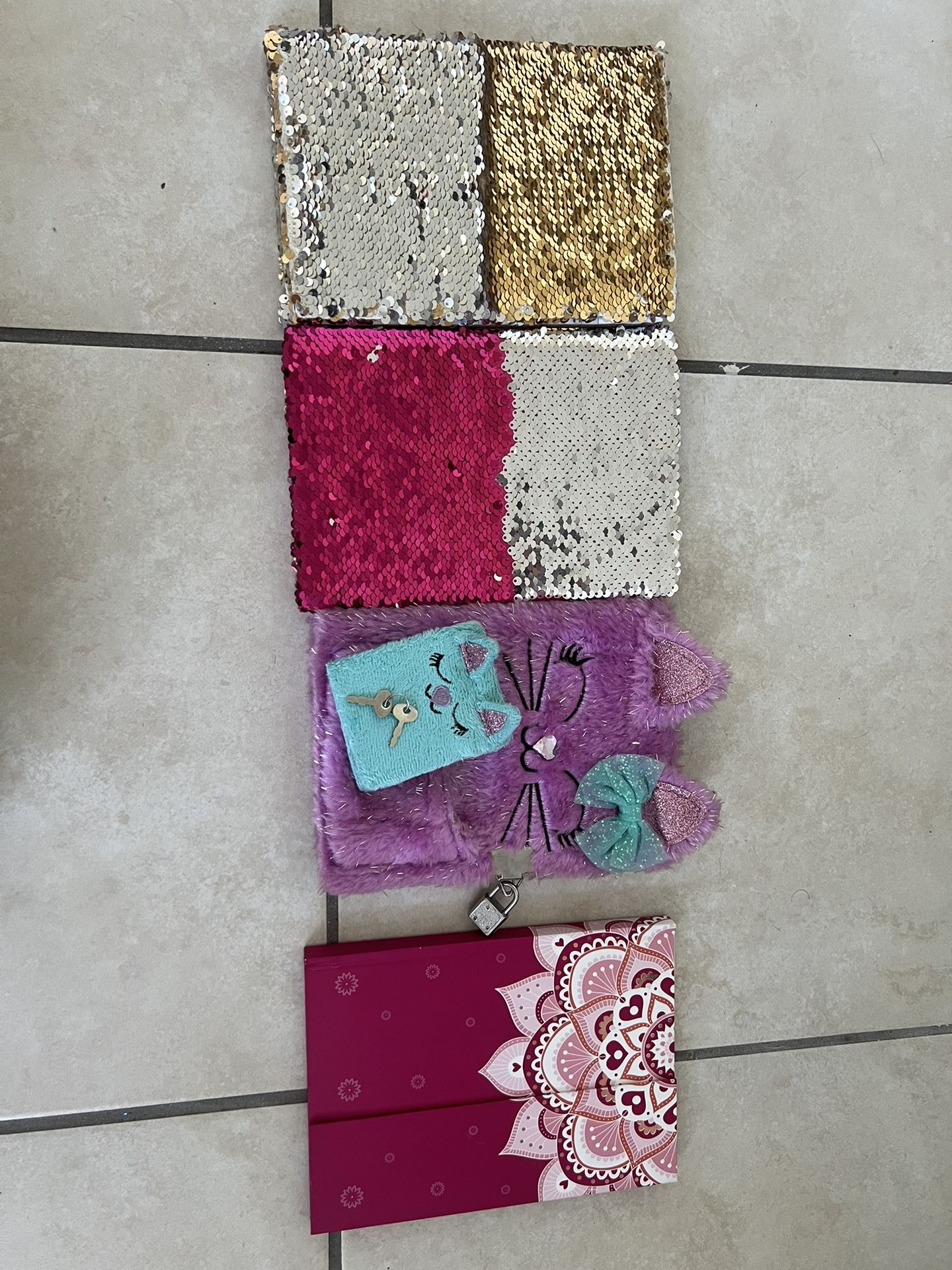 • Set of 4 • Selling individually or as a set • Gold Sequin journal is tearing • Purple cat Journal has two pages missing + mini blue cat journal has one page missing • Price as a set: 10$