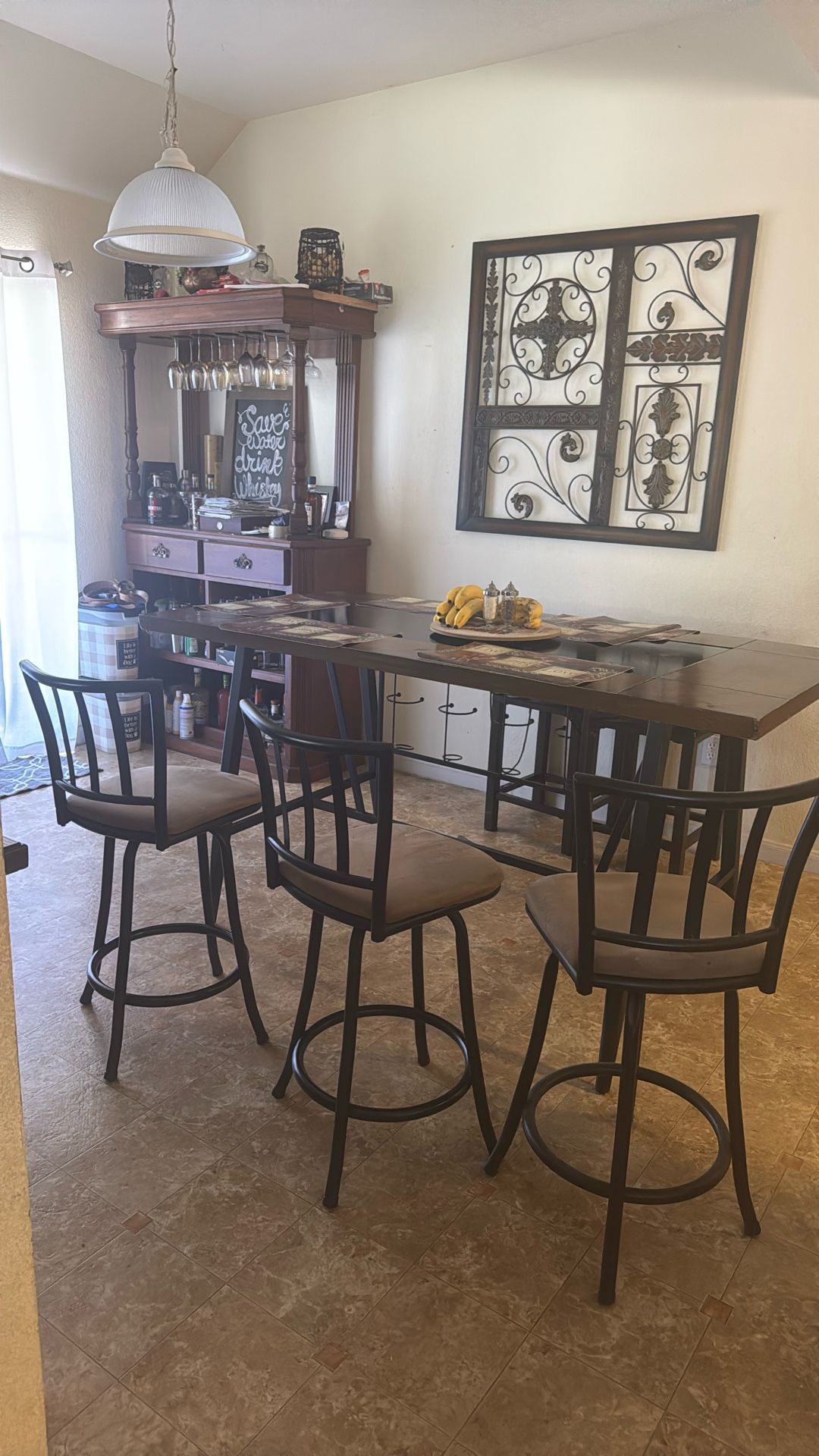 Counter Height Table with 4 stools, 1stool is missing 2 screws from the cushion. Tables has some wear but very sturdy and heavy. It’s brown and medal. Has holders for wine in the bottom.