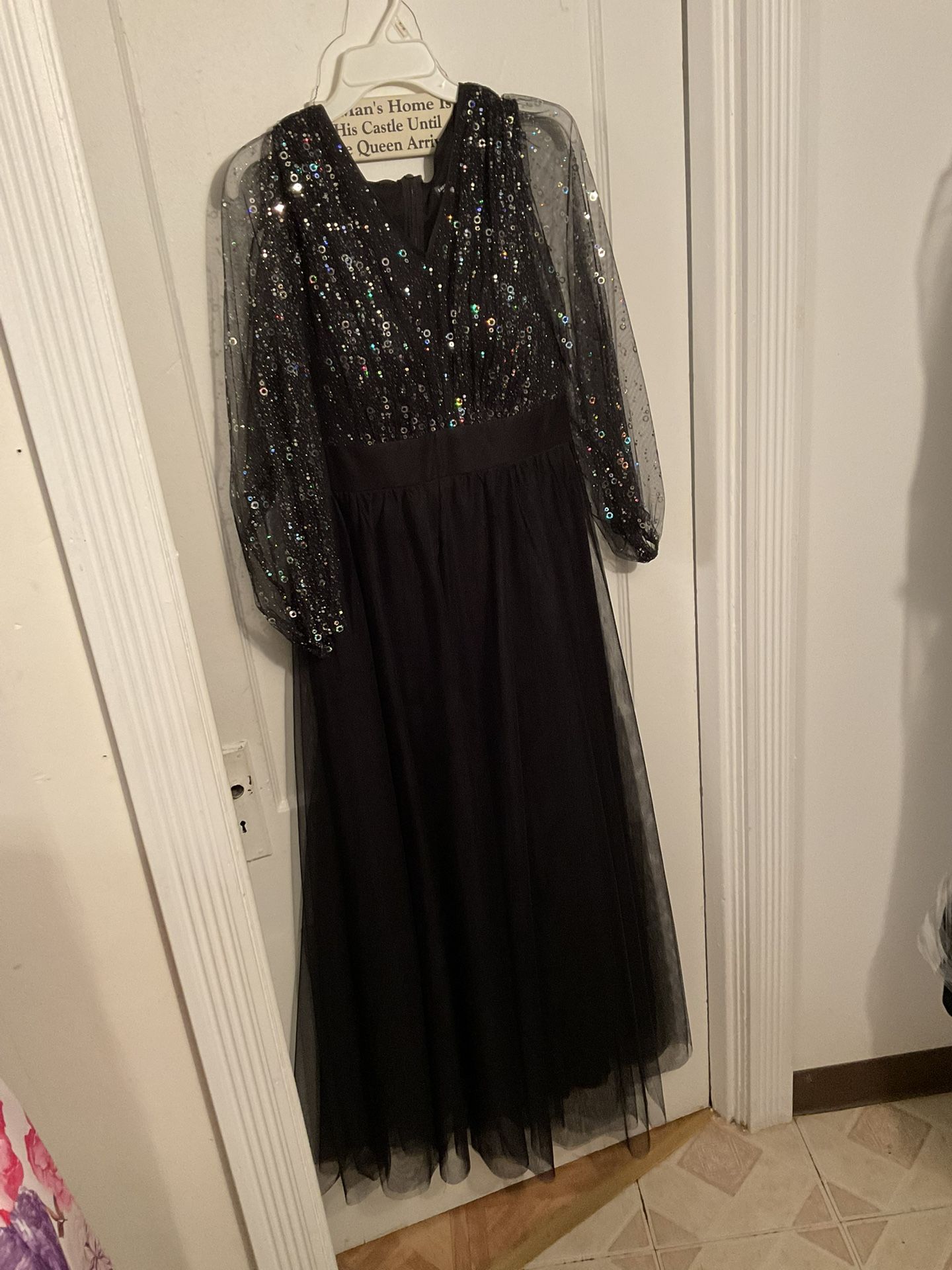 This dress is STUNNING! It has a round neck & 3/4 length sleeves. The top of the dress & the sleeves are made of a black chiffon fabric, & sequins. It has an empire waist that gives a very Slimming effect. The dress is made on an A-Line style. The dress is lined. The bottom half of the dress is also made of a black chiffon fabric with an Overlay which only adds to the Sheer Beauty of this GORGEOUS DRESS! Ladies, DON’T SLEEP ON THIS ONE! GRAB IT today! You’ll thank me later.