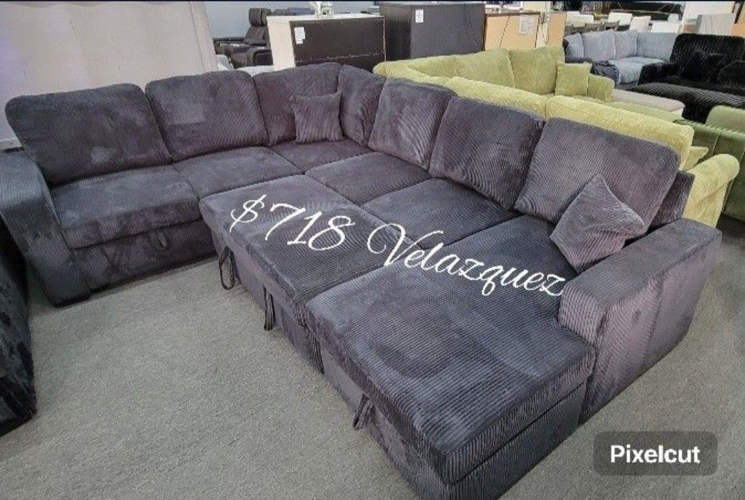 ✅️4 pc Black corduroy fabric sectional sofa with storage chaise and love seat and pop up sleep area in center USB charging. Sectional features a pull out sleep area in center and storage in chaise and love seat, with USB charging on side . Sectional measures 120" x 92" x 60" L chaise x 36"H✅️✅️$718 + sale tax $790 total cash only, this promotion is just pick up only ✅️ Delivery is not available ✅️✅️