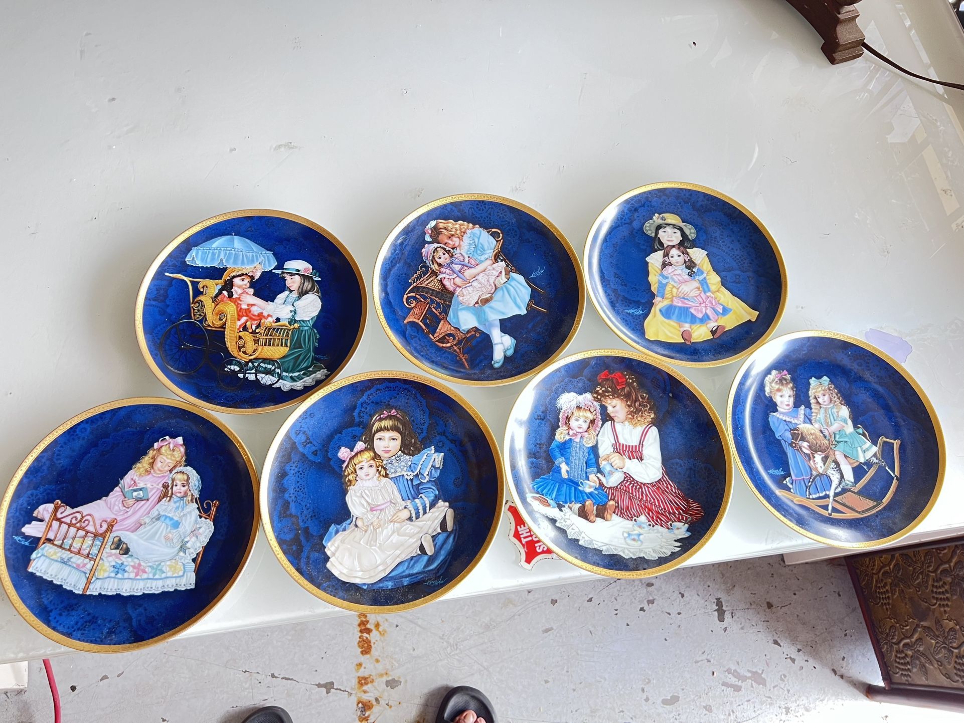 Selling a set of 7 vintage collector plates from the “Forever Friends” series by the Edwin M. Knowles / Hamilton Collection (as shown on backs). These plates feature classic Victorian-style artwork of young girls with dolls—highly detailed and beautifully framed with a deep cobalt blue background and gold trim. Plates included: • Jocelyn & Jeanette • Elvie & Marie • Jacqueline & Renee • Anna & Elise • Elizabeth & Hallie • Hilary & Mimi • Emily & Gretchen All plates are in great condition — no cracks or chips. 📏 Size: approx. 8.5” 🎨 Limited Edition series ✨ Rich cobalt blue + gold trim (harder to find) Perfect for vintage décor, collectors, doll enthusiasts, or wall displays.
