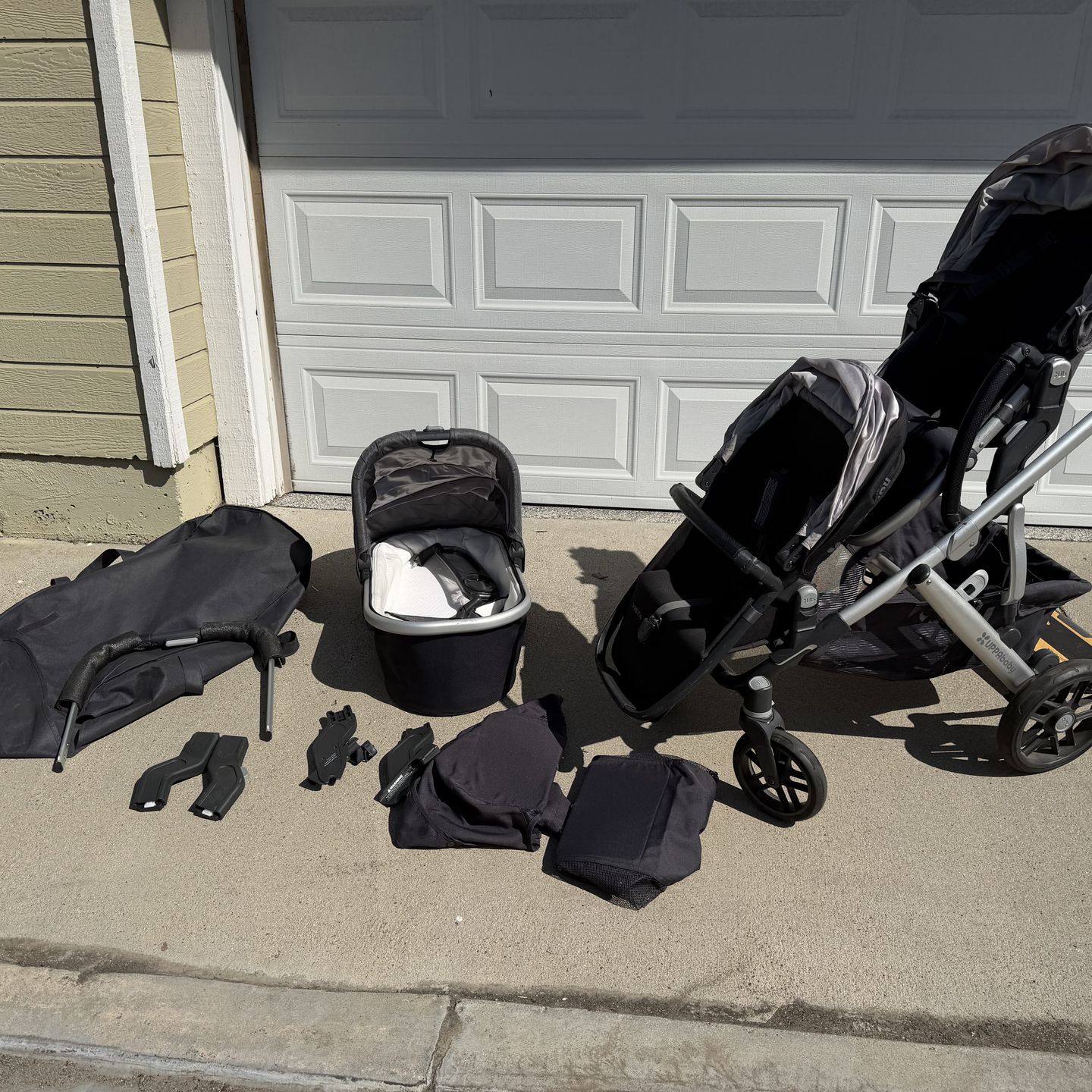 Vista stroller with toddler seat, piggyback skateboard, snack tray, extra brand new handle, Extra basket liners brand new, bassinet included, and cup holder. Also have Nuna pipa adapters with it. Great condition and has a lot of life left!