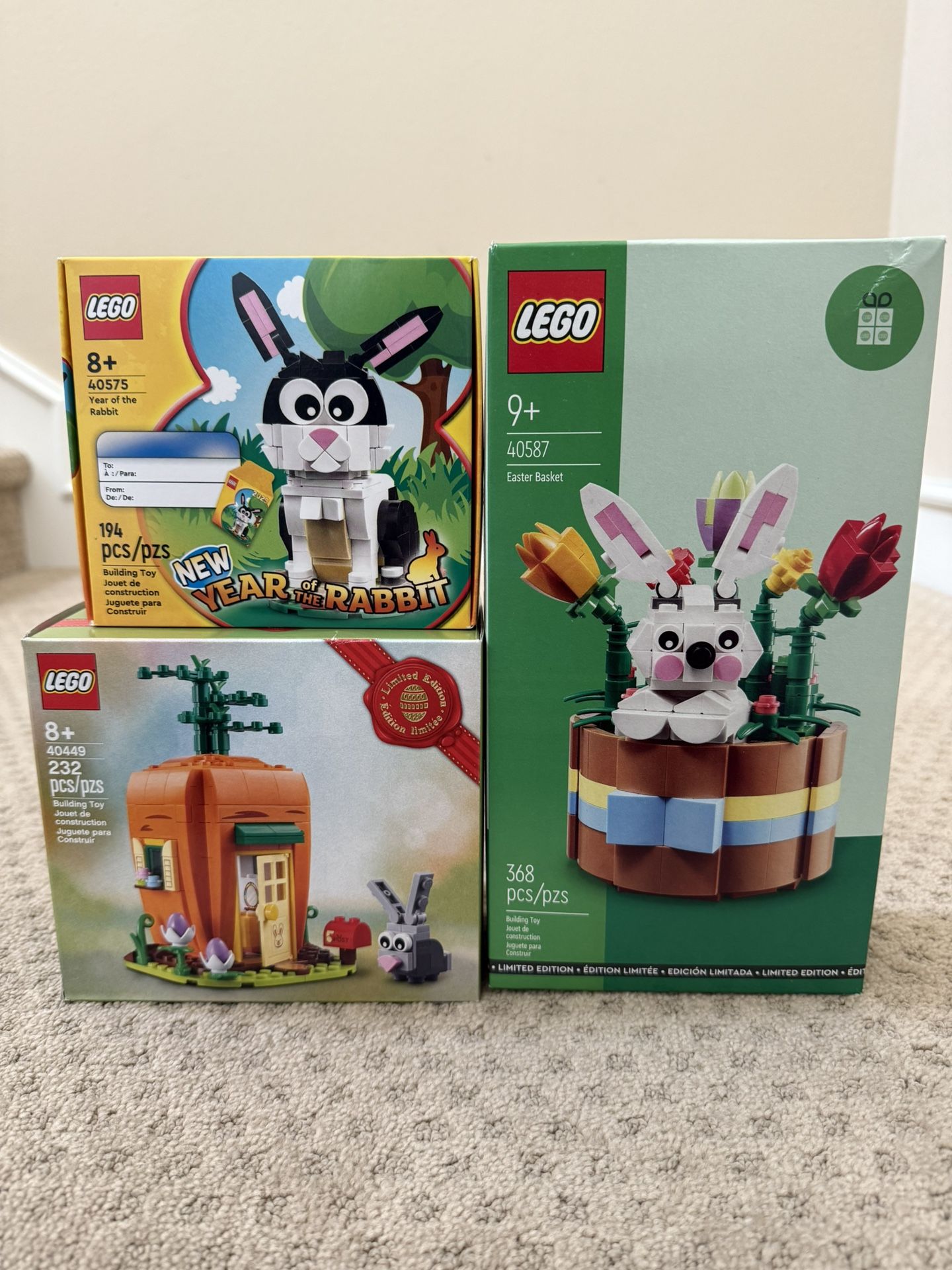 Lego Easter Bunny’s Carrot House 40449 Lego Easter Basket 40587 Lego Year Of The Rabbit 40575 Brand new, sealed. Pick up in Irvine. Cash only.