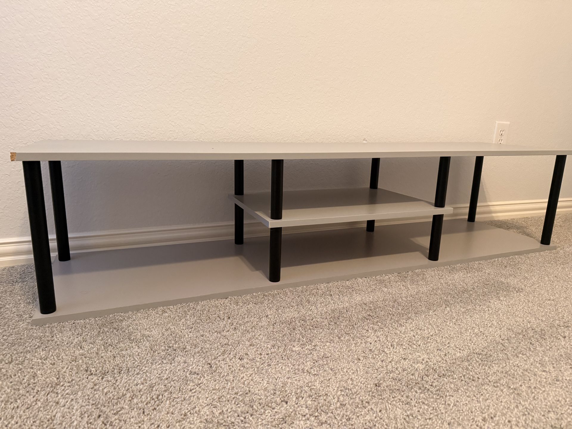 Modern low-profile TV stand in good condition. Gray wood finish with black legs Open shelves for storage (great for consoles, router, decor) Fits TVs up to ~65” Sturdy and lightweight Minor cosmetic wear on one corner (see photo), otherwise in great shape. $45 OBO Pickup in Wylie.