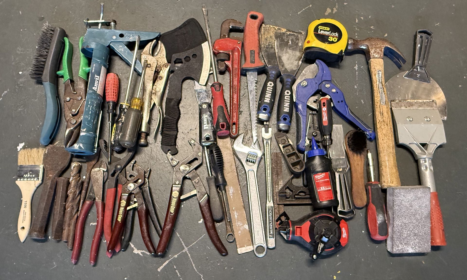 Up for sale today is this whole lot of miscellaneous tools in great pre-owned condition. Tools range from jab saw, hammer, flat heads, spatulas, adjustable wrench, caulking gun, wire brush and much more!! First come first serve. I do not hold items. I do not reply to is this still available. Thanks for looking. Cheers