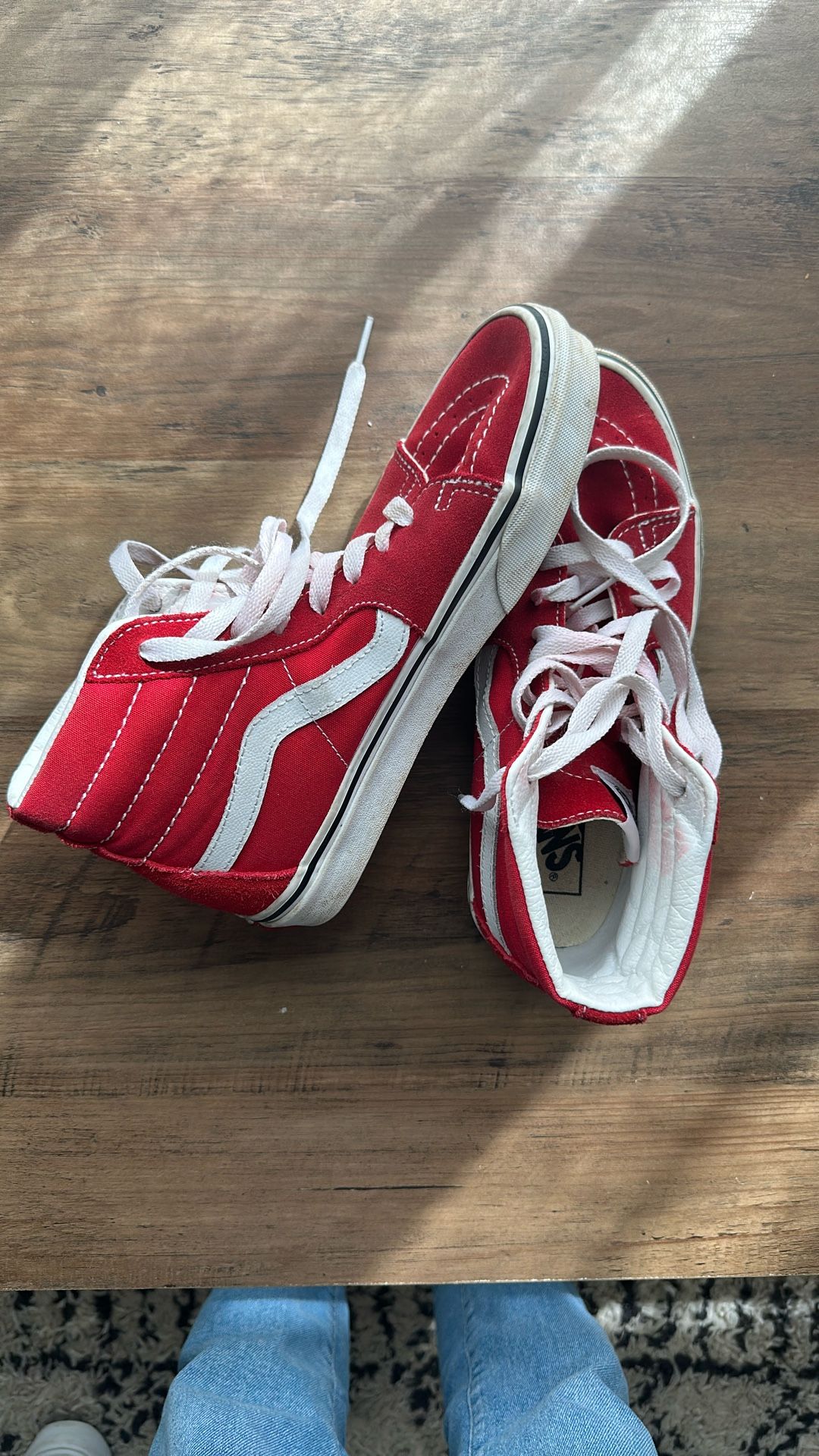 Red high top vans in good condition Some stains on laces Men’s size 6 Women’s size 7.5