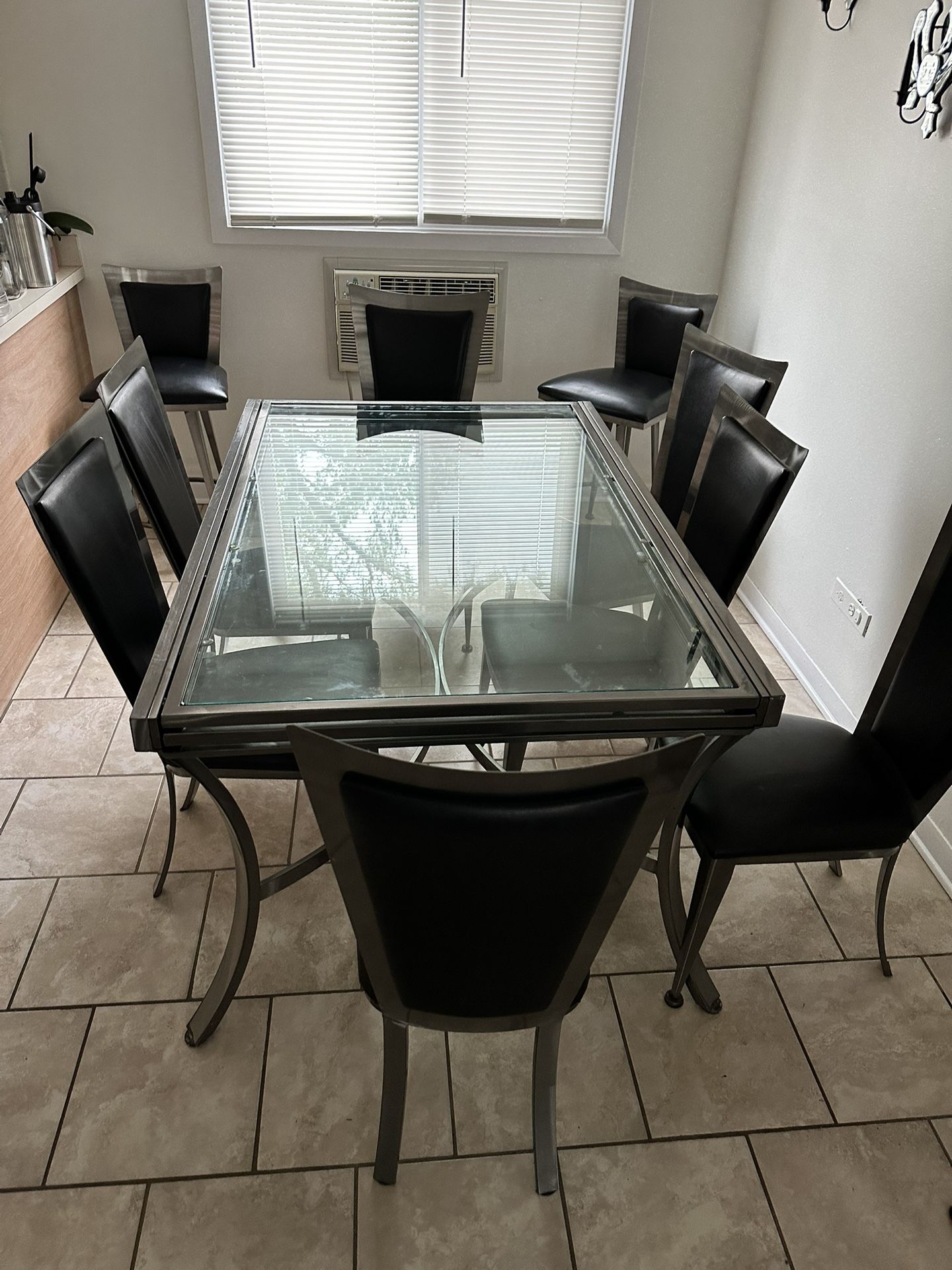 60 in L x 40 in W x 30 in H Converts into double its size! 120 in L One of a kind Modern style dining set.. makes great for hosting! - 6 dining chairs -Thick glass - Glass extension hides under top glass -Heavy, durable material (stainless steel and pleather like) -Excellent condition, have to downsize therefore selling. * I have 3 matching counter height stools (seen in corner of picture) for $100 total * Asking $850 OBO ——————————————————————— 60 in de largo x 40 in de ancho x 30 in de alto ¡Se convierte al doble de su tamaño! 120 in de largo Un juego de comedor único de estilo moderno... ¡ideal para recibir invitados! - 6 sillas de comedor - Vidrio grueso - Extensión de vidrio oculta bajo el vidrio superior - Material resistente y duradero (acero inoxidable y imitación cuero) - Excelente estado * Tengo 3 bancos altos que hacen juego con comedor (en la esquina de la foto) por $100 en total * Pido $850 o mejor oferta