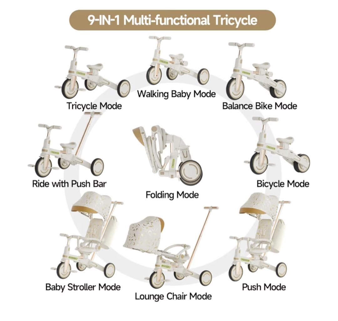 Brand New Unopened Box Stroller/Tricycle WinHope 9-in-1 Push Tricycle for Toddlers 1-3 Years | Convertible Kids Trike with Adjustable Parent Handle & Safety Harness, Lightweight Foldable Design + Storage Basket for Boys & Girls (White) Pick up only
