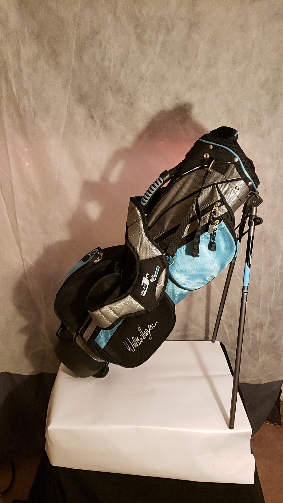 Lightly used Walter Hagen Jr. Golf bag series 3. It's in good shape and there are light scuffs on the bottom piece which is hard plastic. It comes with the cover and 1 club sock. $80 OBO. Thanks for looking and check out my others items.
