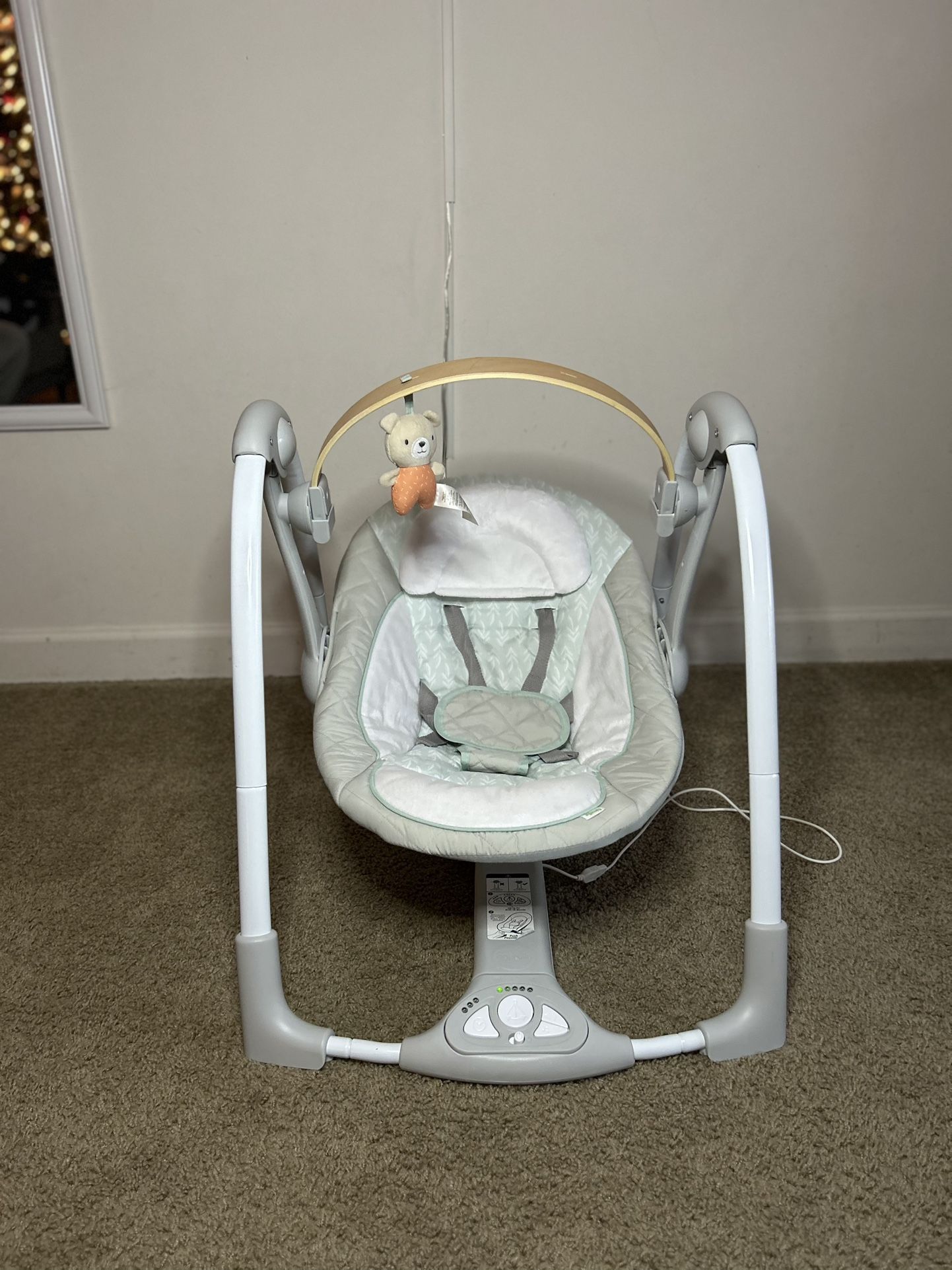 Ingenuity Every Season Baby Swing (Portable Swing) Blue grey baby swing Plays music. Swing speed up to 4. Nature sounds. Gently used. Infant did not like using the swing. OBO