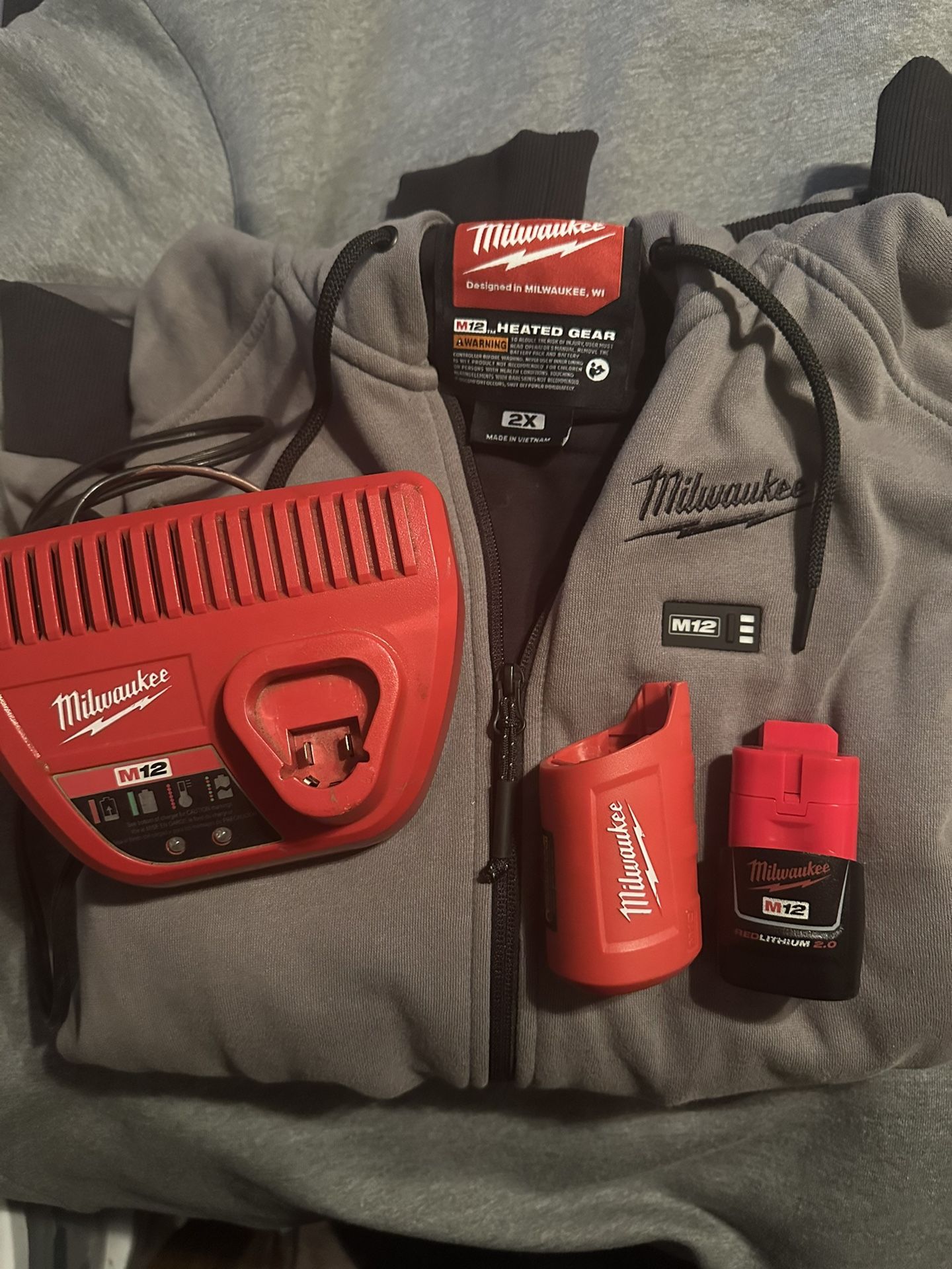 Milwaukee Men's Large M12 12-Volt Lithium-Ion Cordless Gray Heated Jacket Hoodie Kit Works great, come with charger, battery and adapter. The SIZE IS A 2X (2XL) 100.00