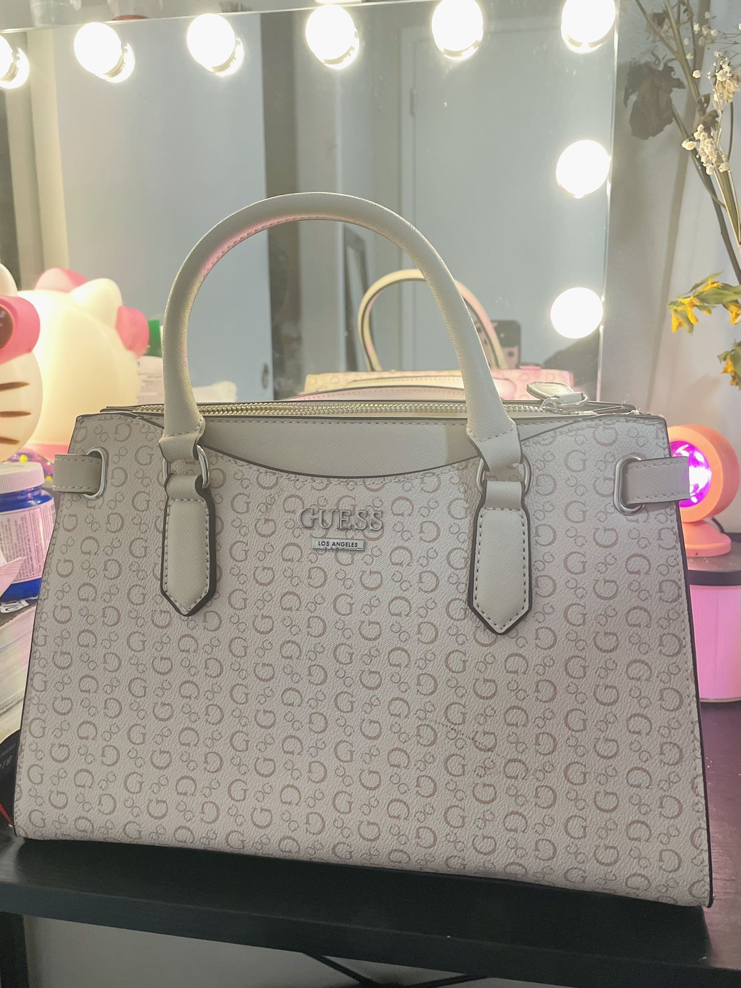 Cute and stylish Guess monogram satchel handbag in a neutral beige/cream color. Features the signature “G” logo print all over with gold-tone hardware and a structured shape.