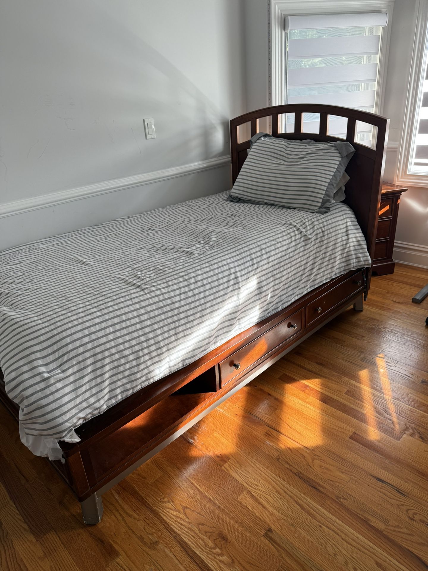 Mahogany woo d twin bed in great condition, very strong and heavy . Comes with two drawers on the bottom and a nightstand. Bought for around 2k bedding and mattress included . Pillows are not included just the pillow bedsheets. Must be picked up and brought down stair case. In amazing condition!!!