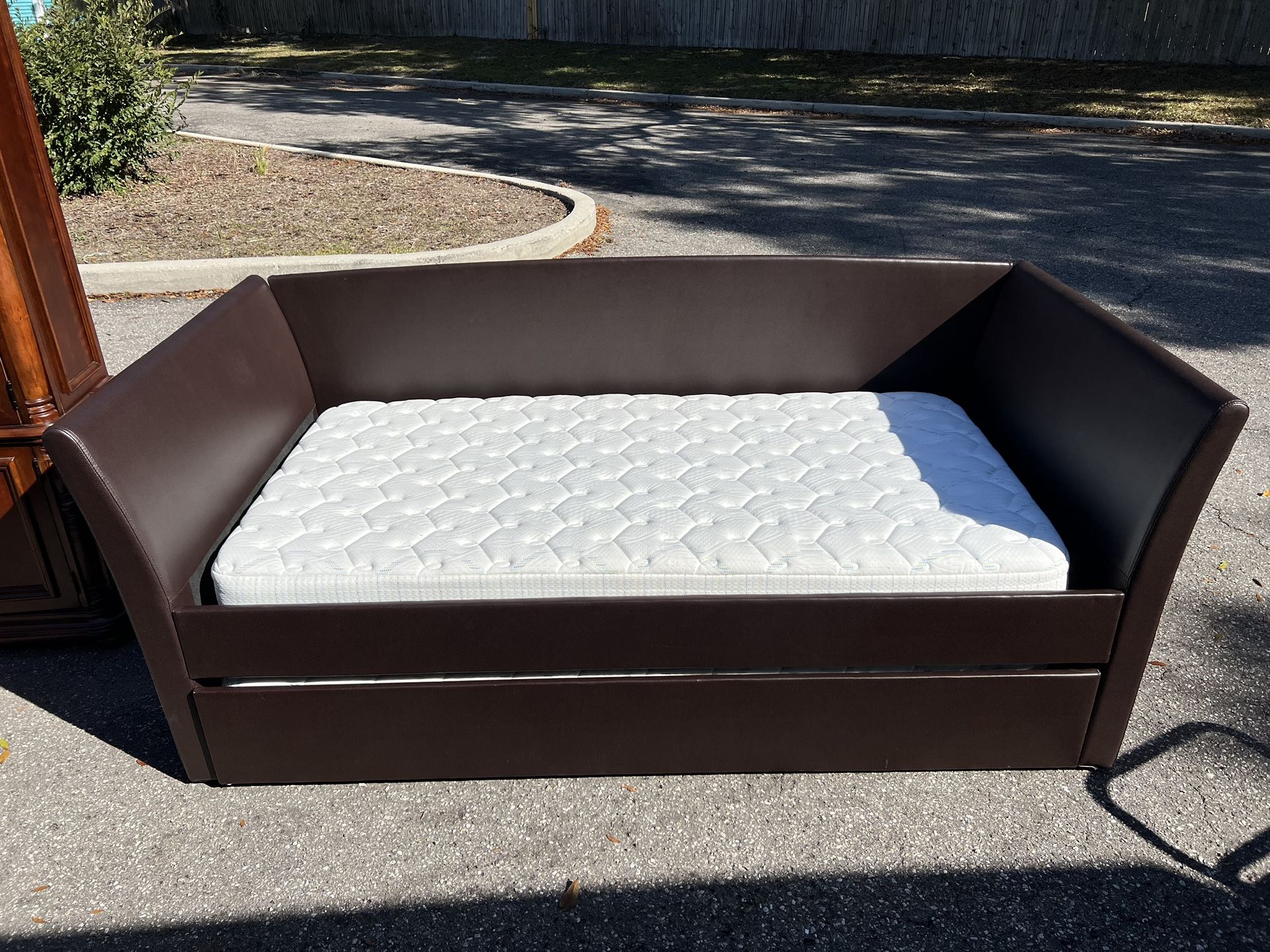 Almost brand new daybed with brand new mattress that have just been taken out of the plastic but never used. Only 1 small imperfection on pull out drawer. Both sizes of the beds are twin size. Retail with mattress would’ve been $1100+. Just one mattress because the other one has sold.