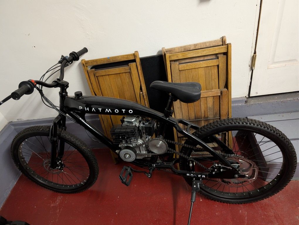 Selling my Phatmoto Rover, a gas-powered motorized bicycle known for its strong build and great off-road capability. The frame, wheels, and overall body are in excellent shape — no rust or dents, and everything looks clean. The bike has been stored indoors and treated well. It currently has old gas in the tank and a clutch that needs adjustment or replacement, but the engine and drivetrain are intact. With a little work, it can easily be brought back to full running condition. Because of the solid frame and clean condition, this is a great deal for anyone looking for a project bike or wanting to save by fixing a minor issue. These go for $800–$1,000 new, and with how solid this one’s body is, $350 is a fair price for anyone who knows what they’re getting — either for repair, parts, or a quick build. This is my final price.