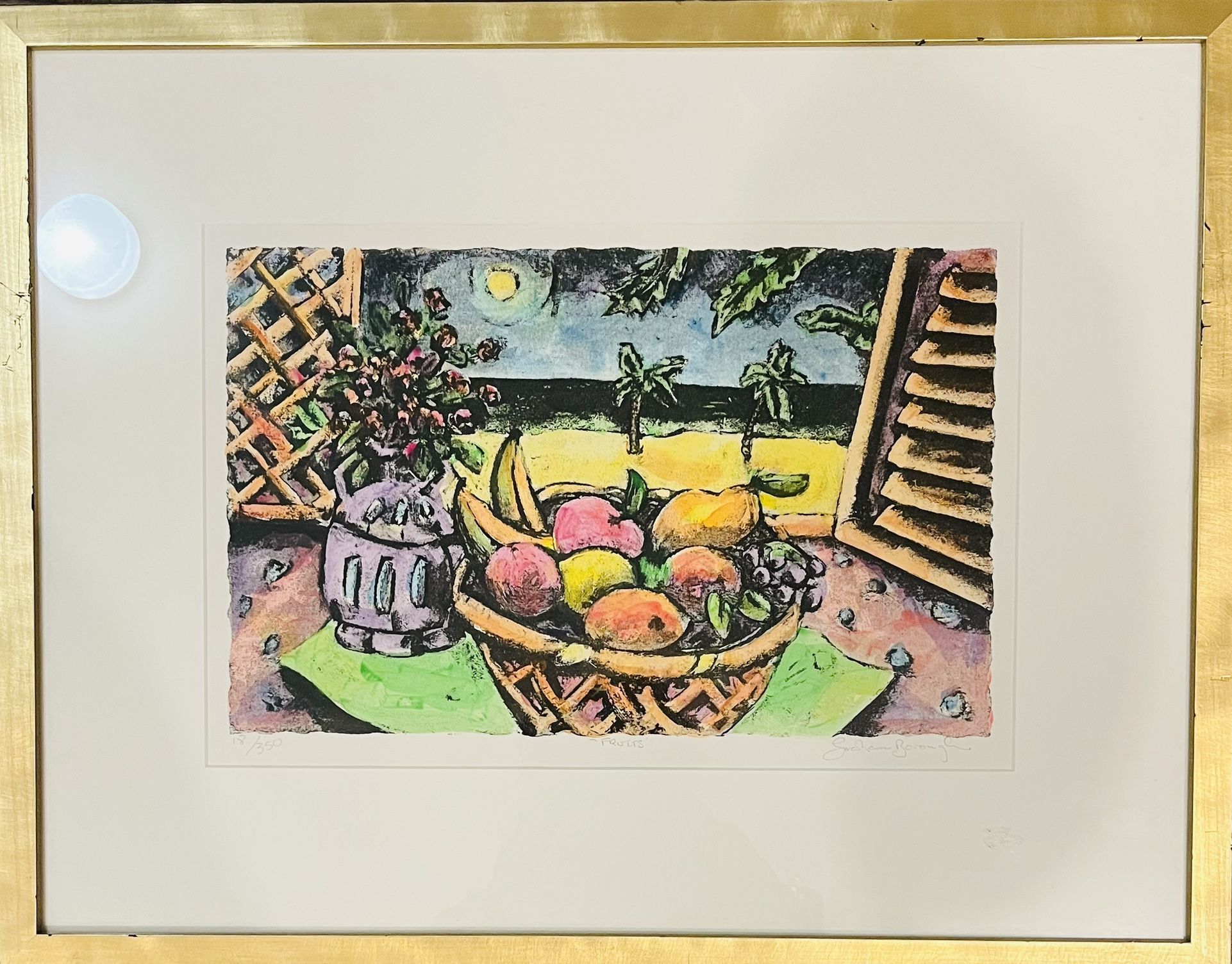 Bring a touch of playful sophistication to your collection with this charming still life lithograph. A woven basket brimming with an assortment of colorful fruits takes center stage, while a whimsical vase of flowers and a glimpse of a moonlit tropical landscape through a window add layers of visual interest. The artist's expressive lines and bold color choices create a lively and engaging composition. The lithographic process lends a unique texture and depth to the image, making it a truly special piece. Signed by the artist