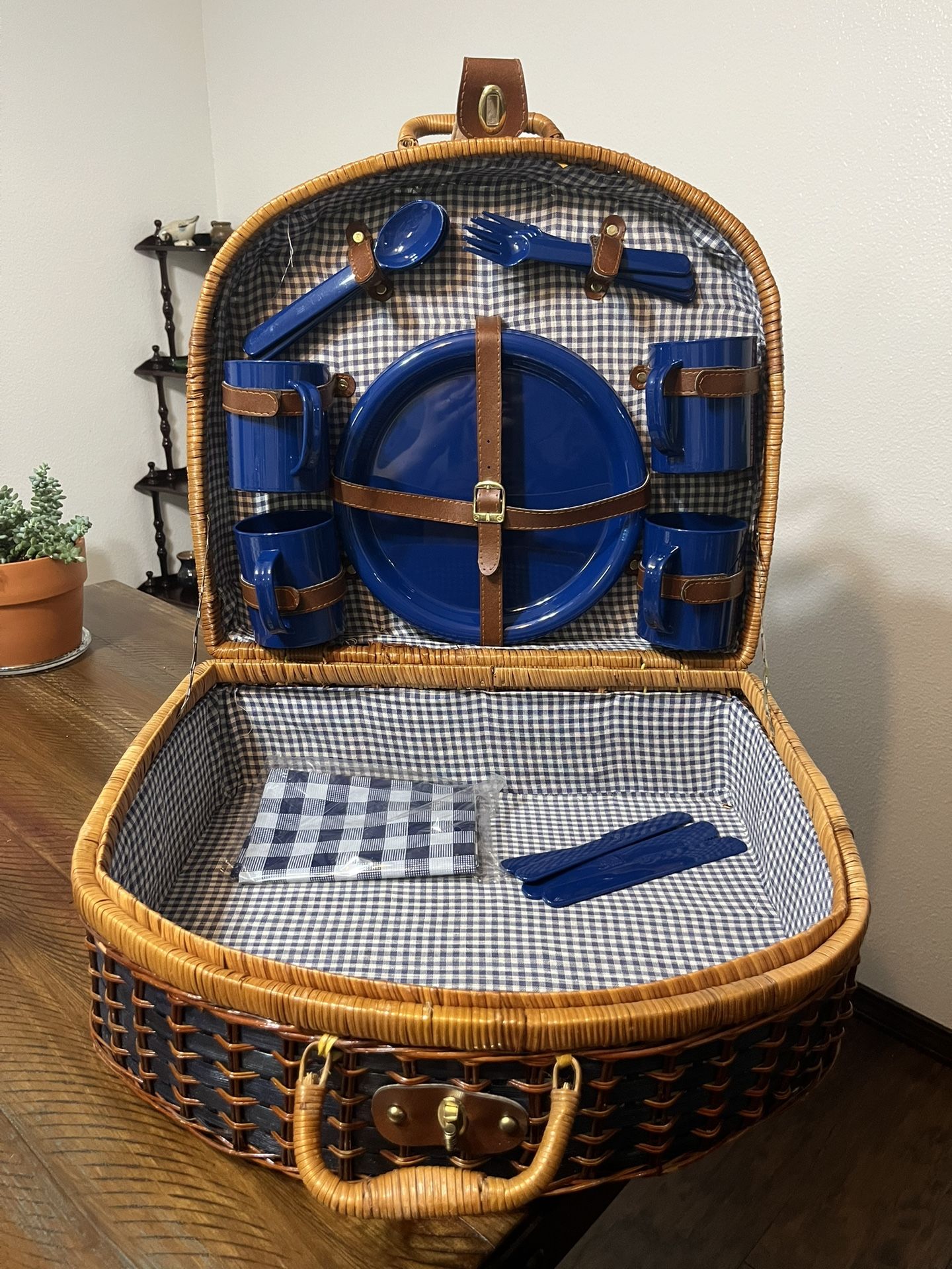Vintage picnic basket. Comes with plastic blue utensils and a plastic table cloth. Never used. Perfect for a picnic date!