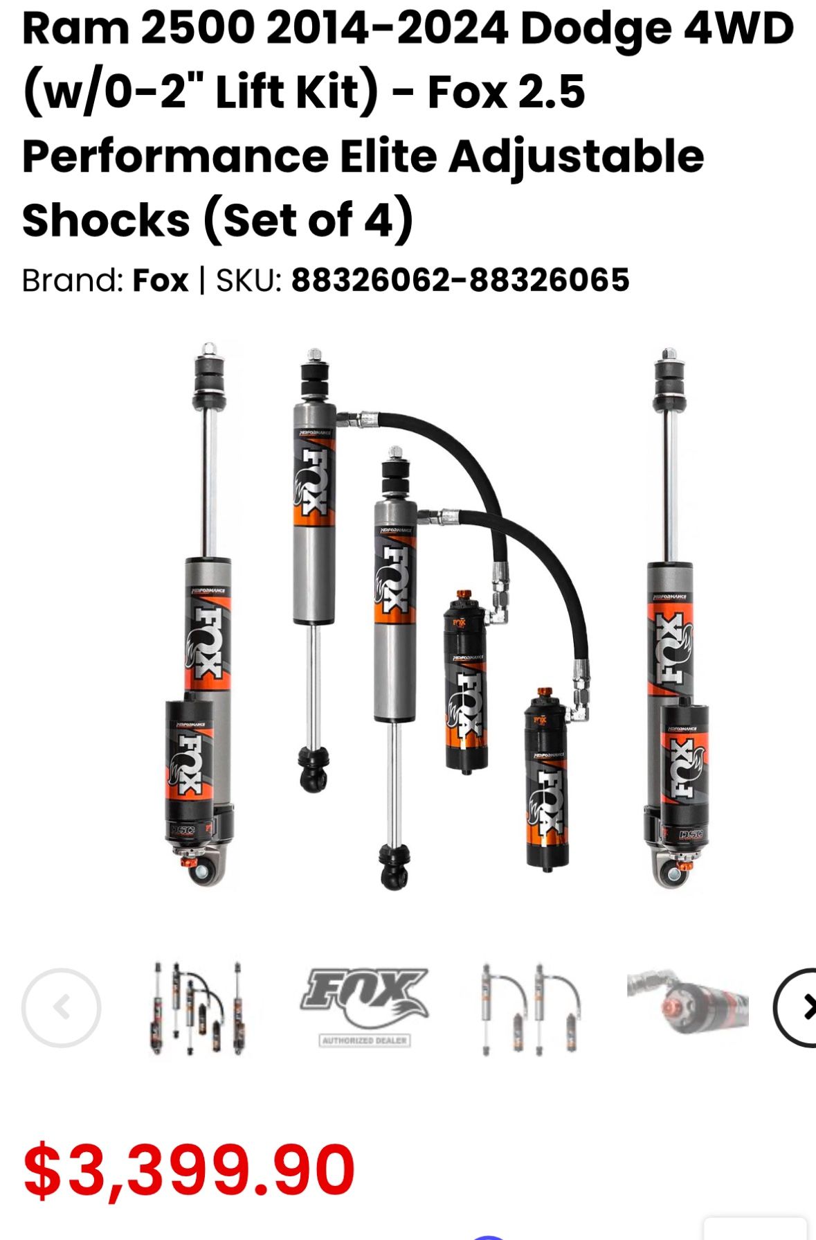 Fully adjustable 2.5 shocks front and rear. Fit ram 2500 stock to 2” lift. They were ran on truck for right around 5000 miles, sold truck and pulled off before. Possible trade for a Yamaha TW 200